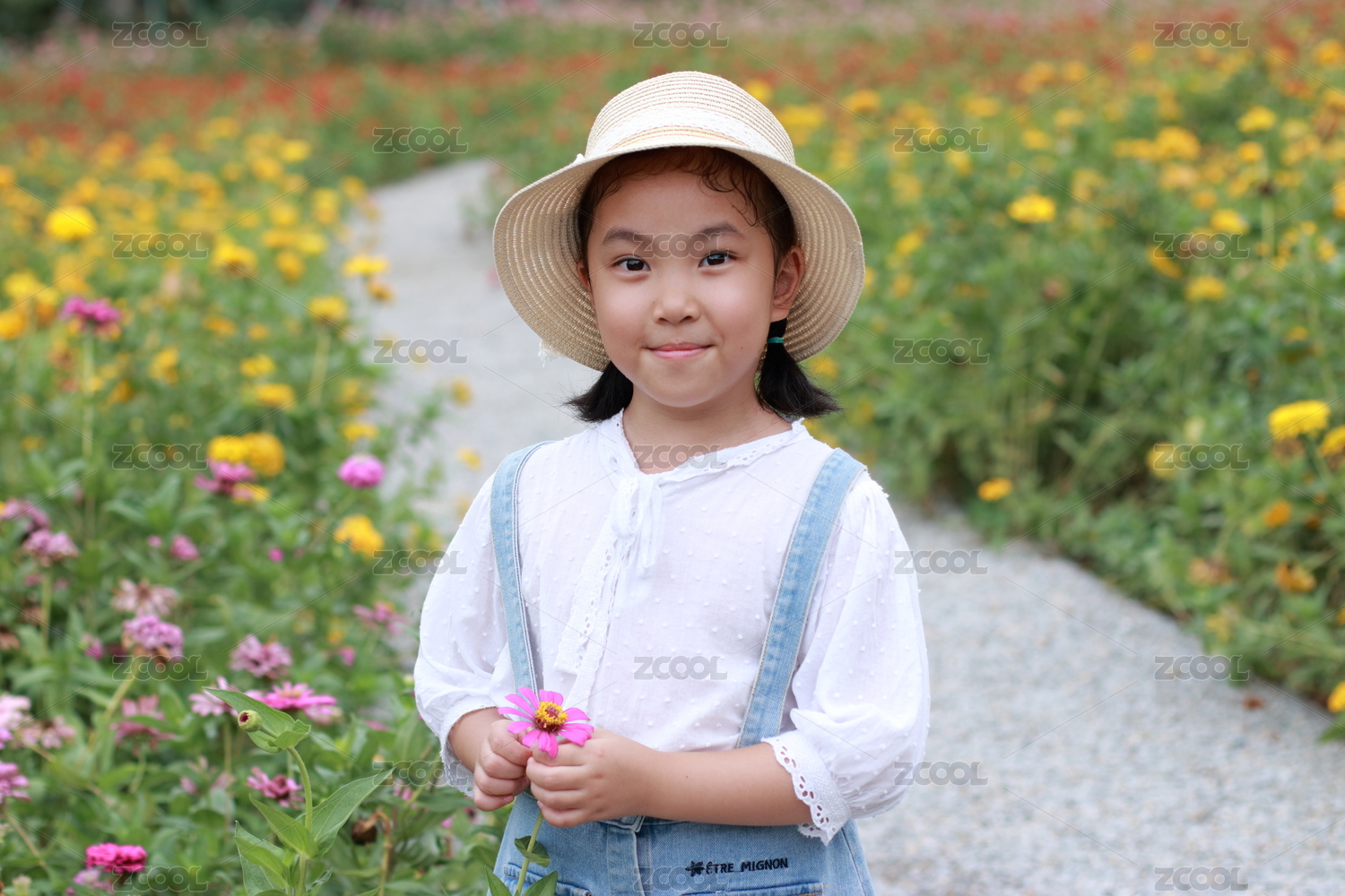 在百日菊花海中玩耍的小女孩