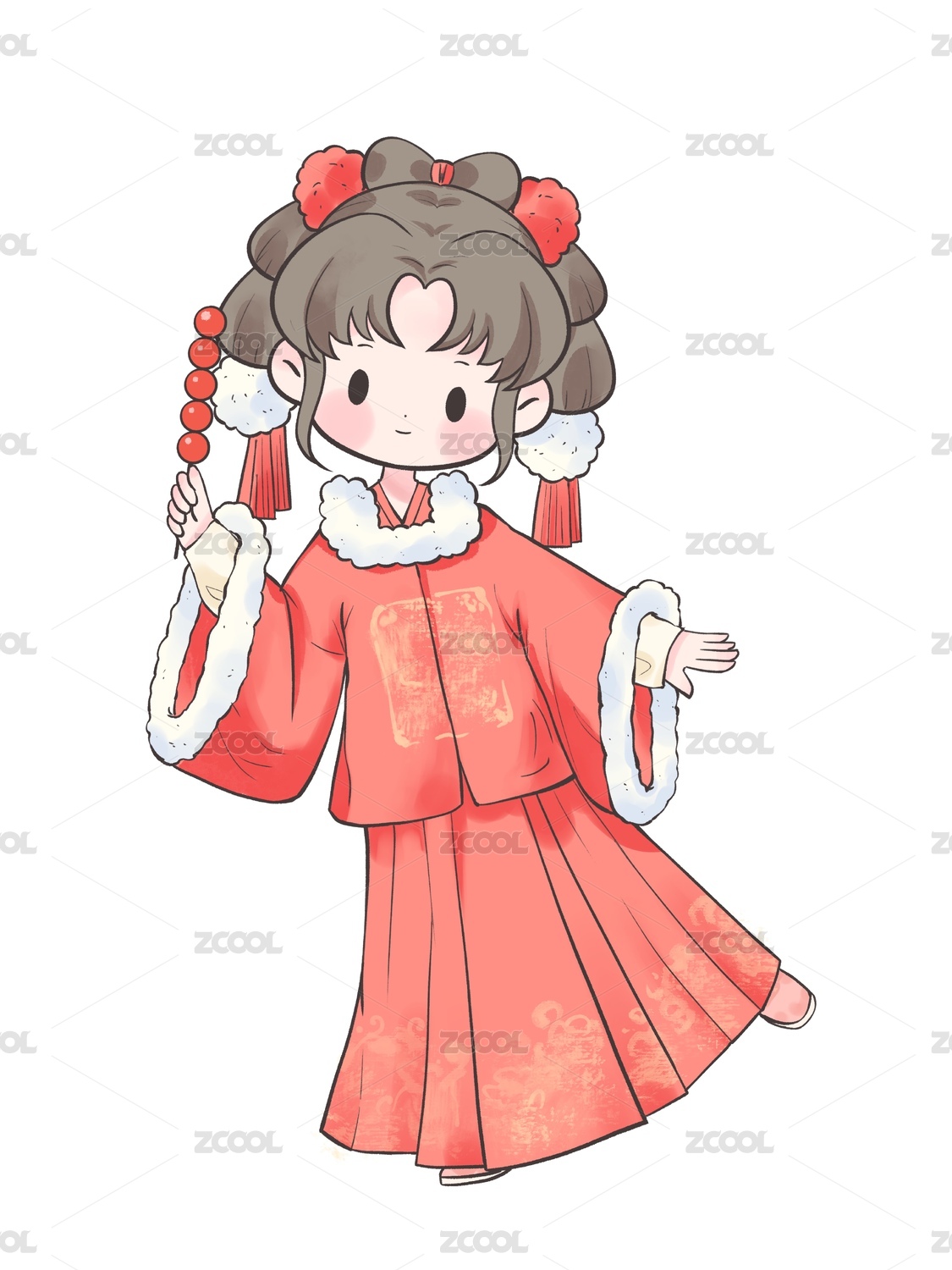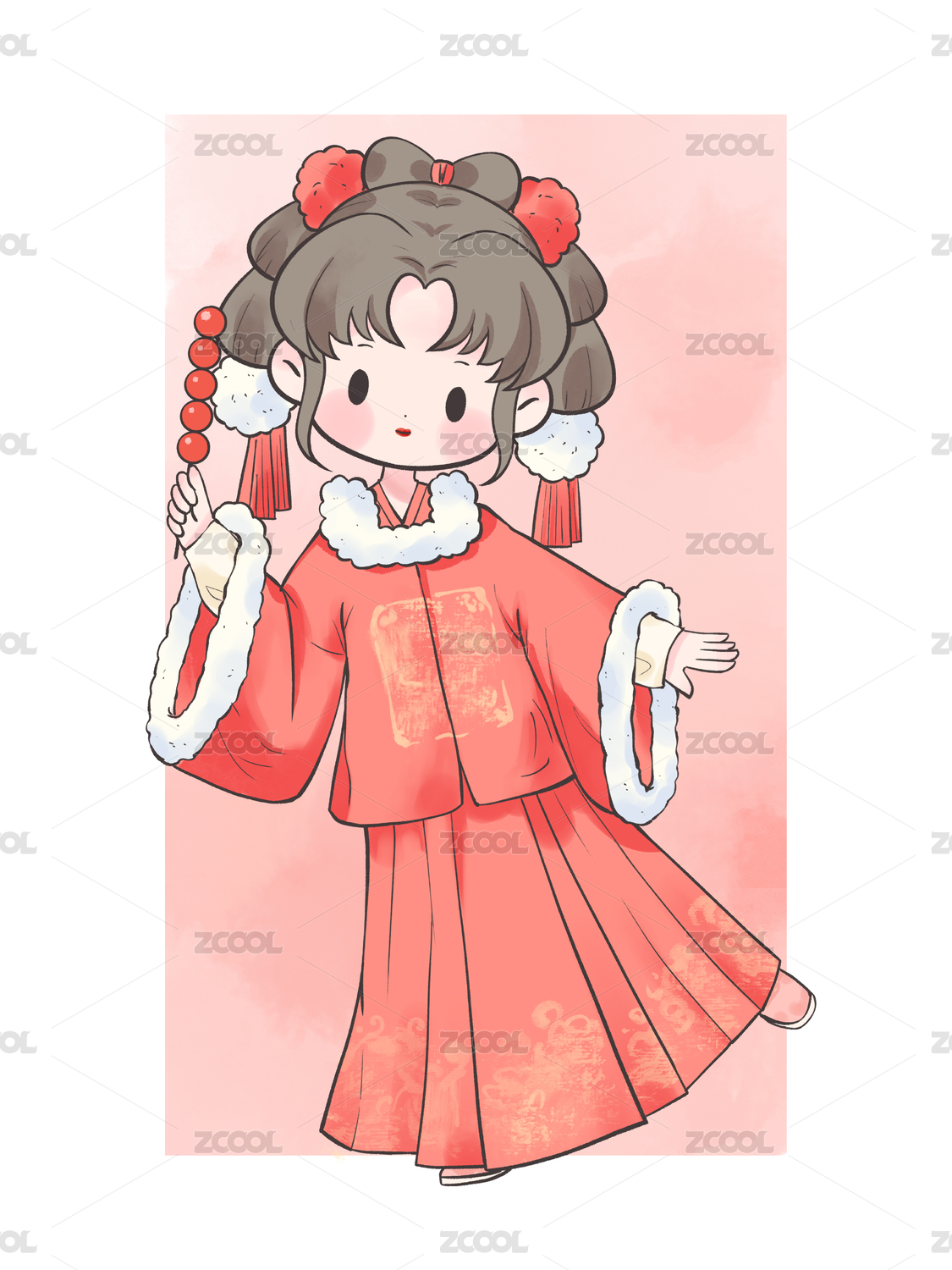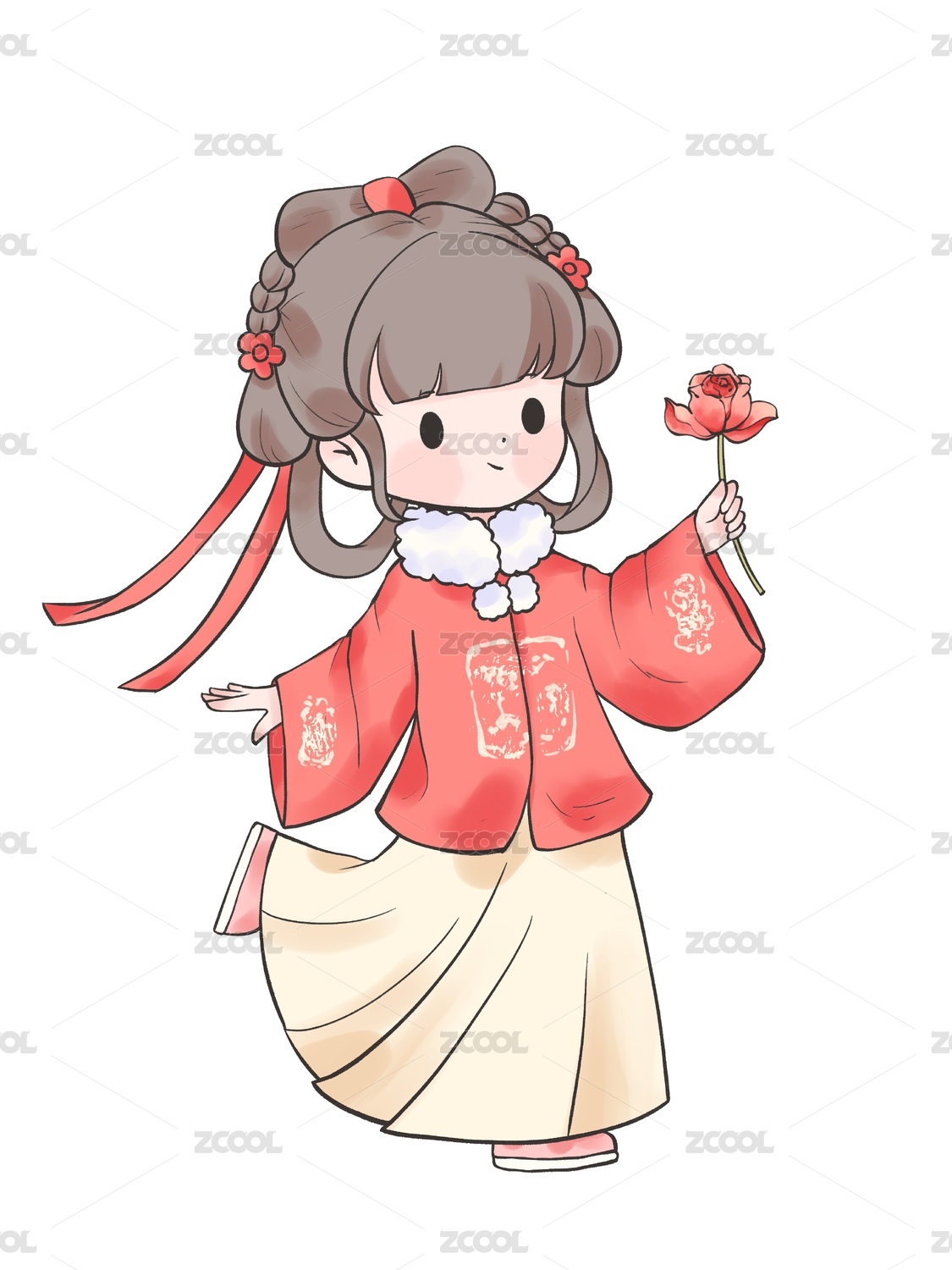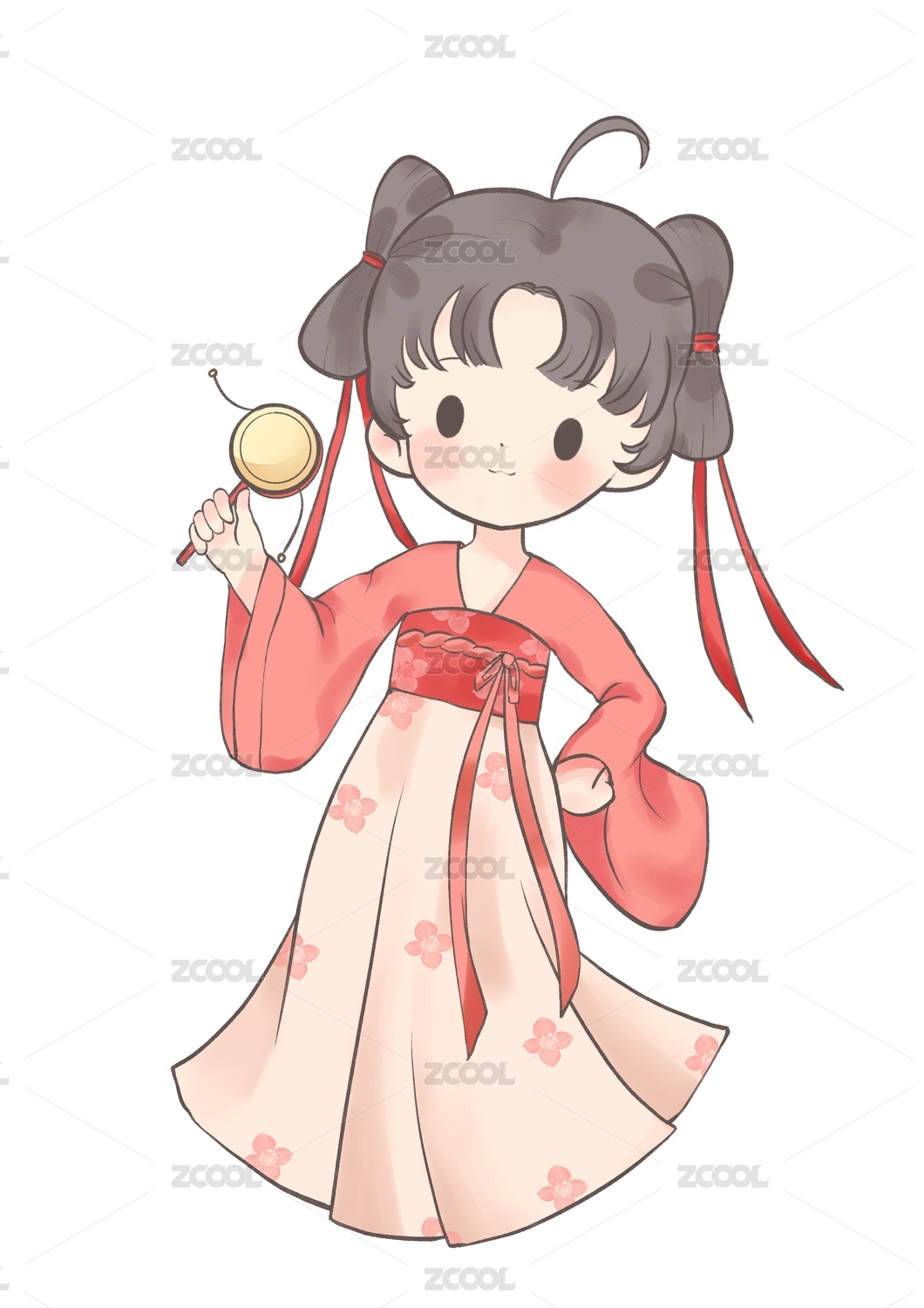古风手绘Q版红色汉服女孩拿拨浪鼓过年