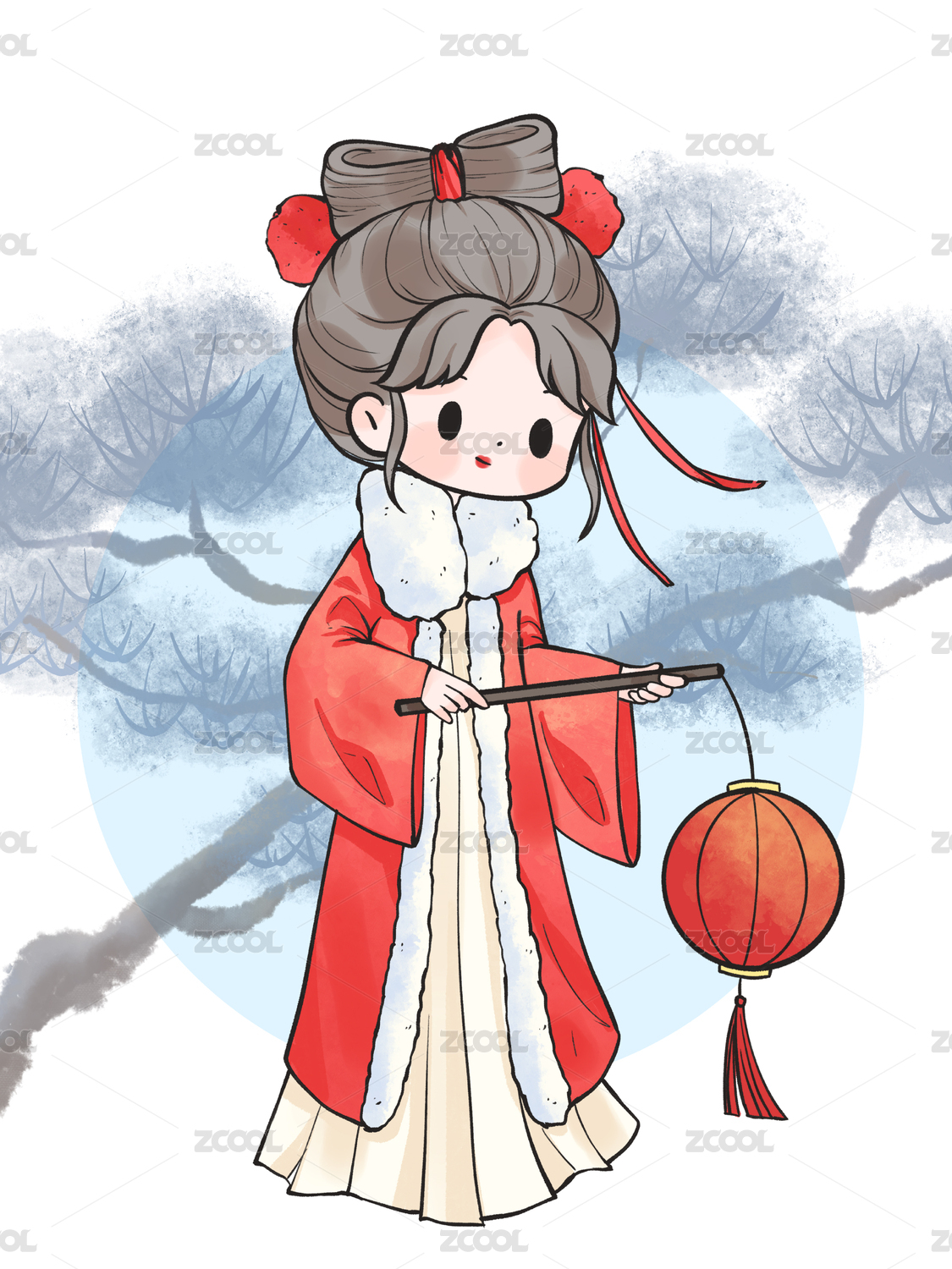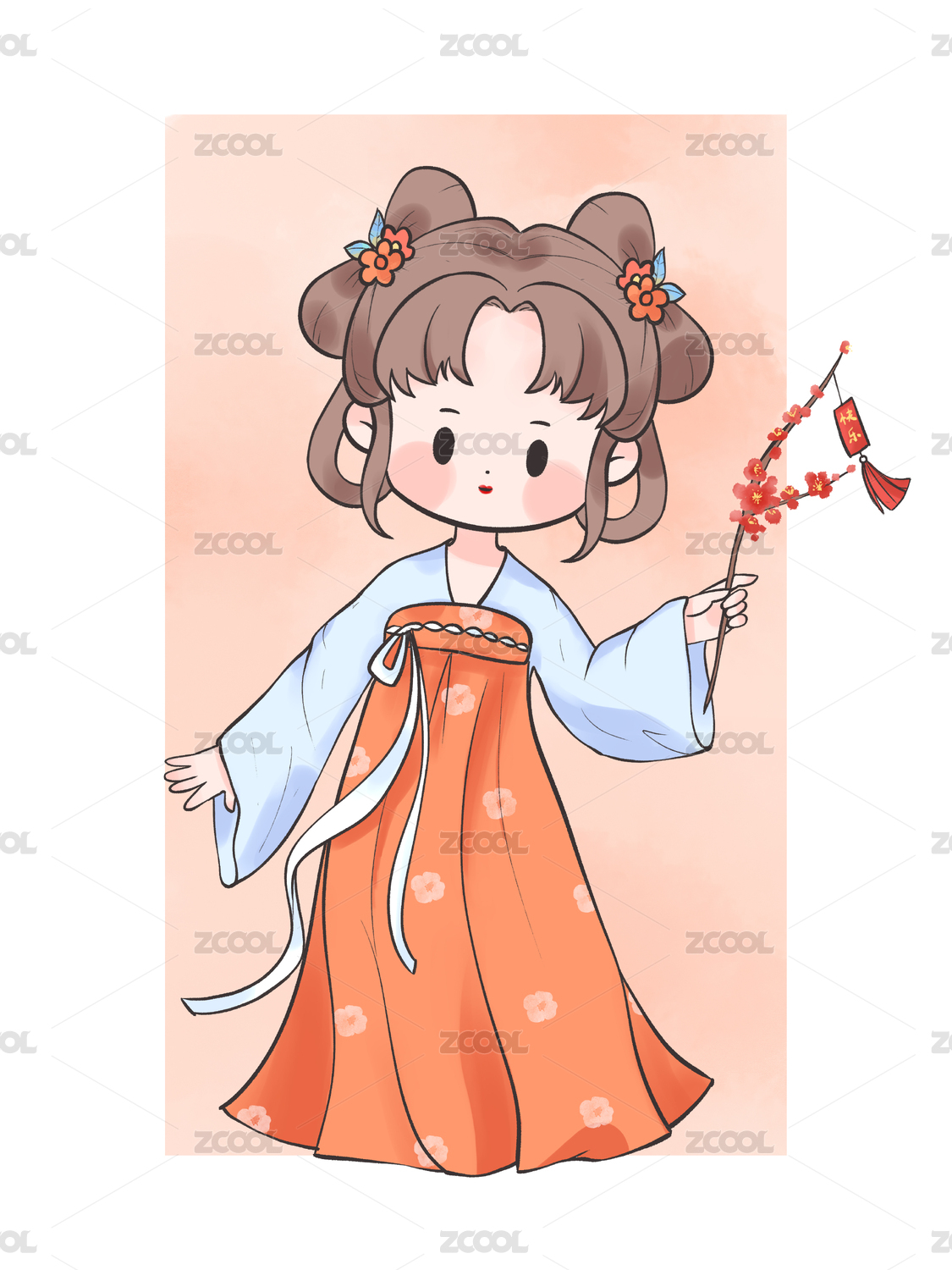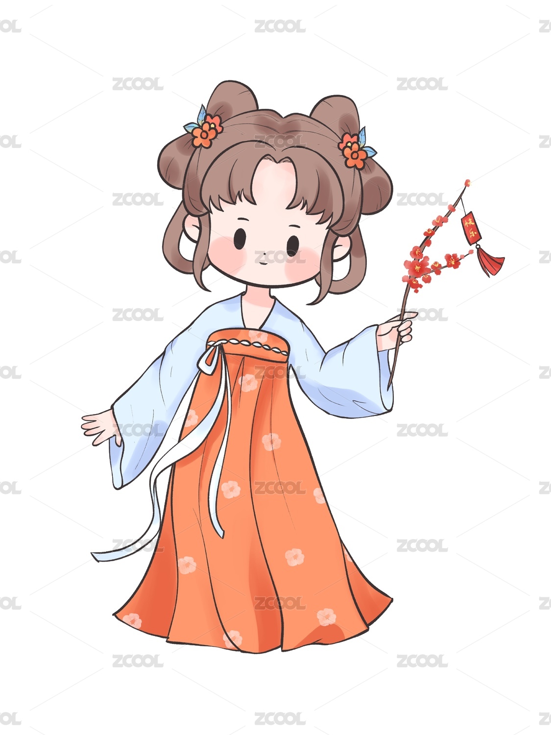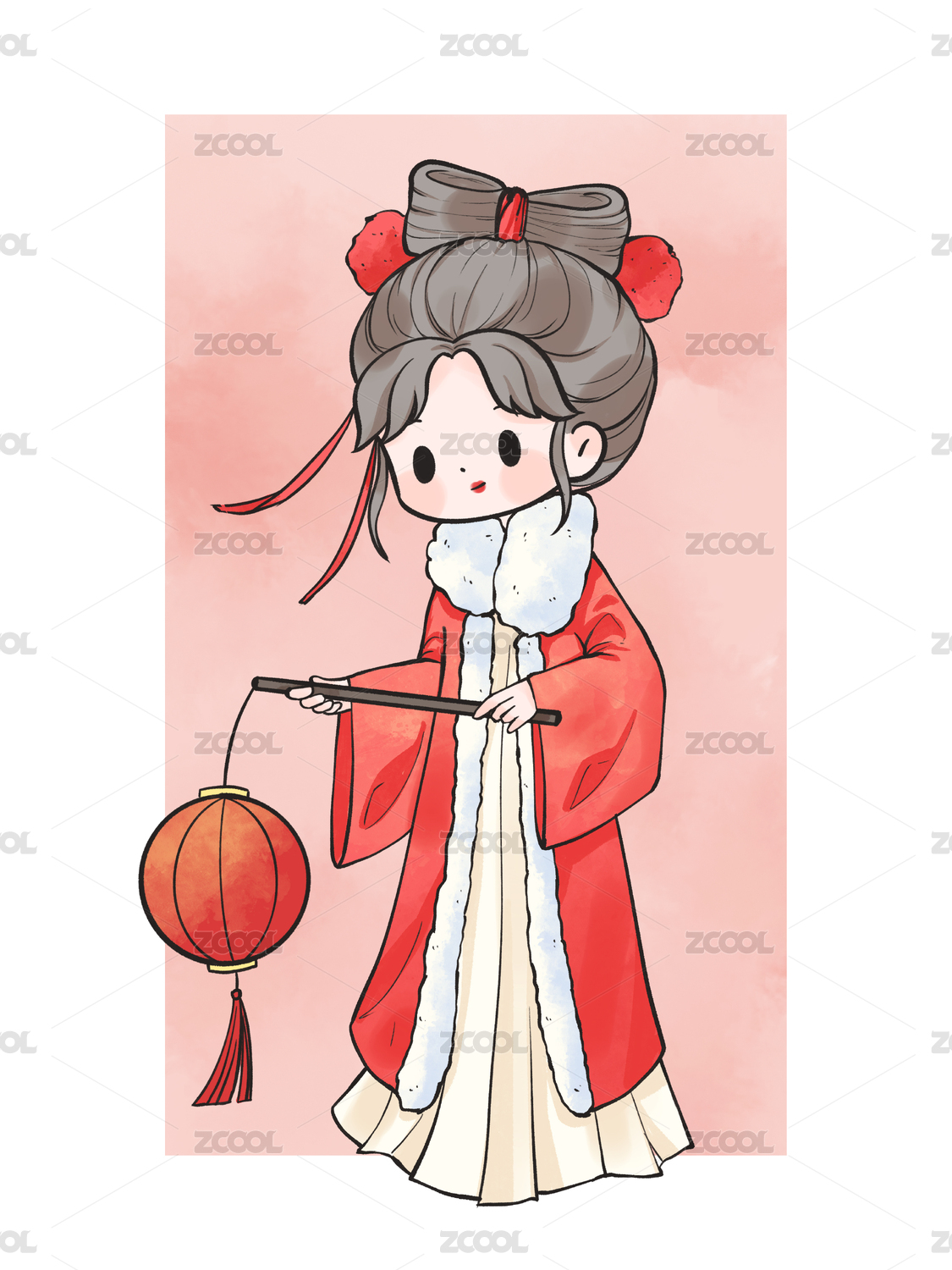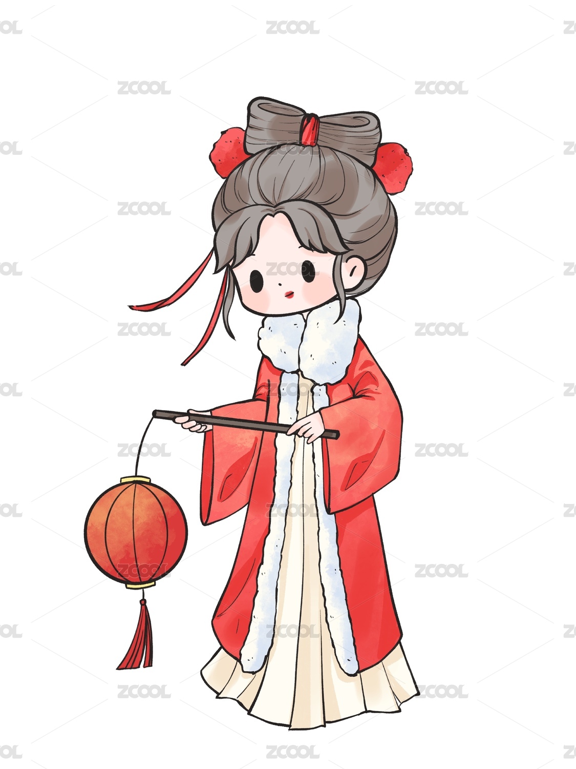 古风手绘Q版红色汉服女孩拿拨浪鼓过年