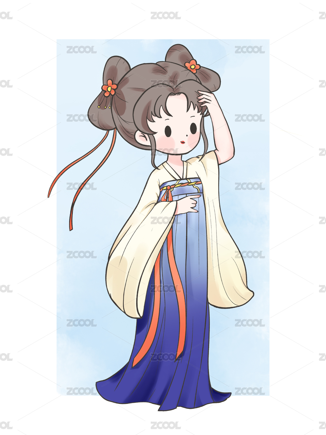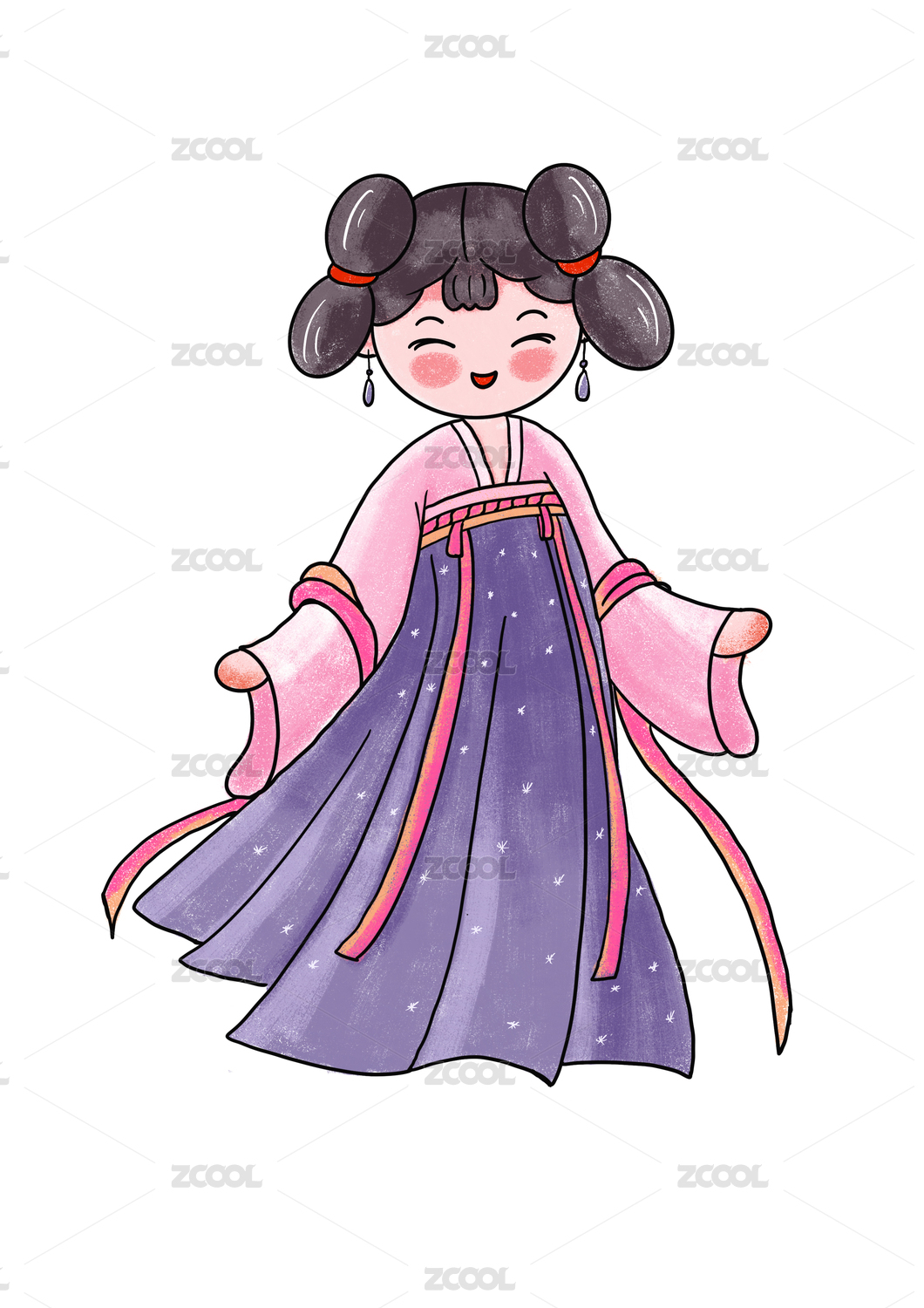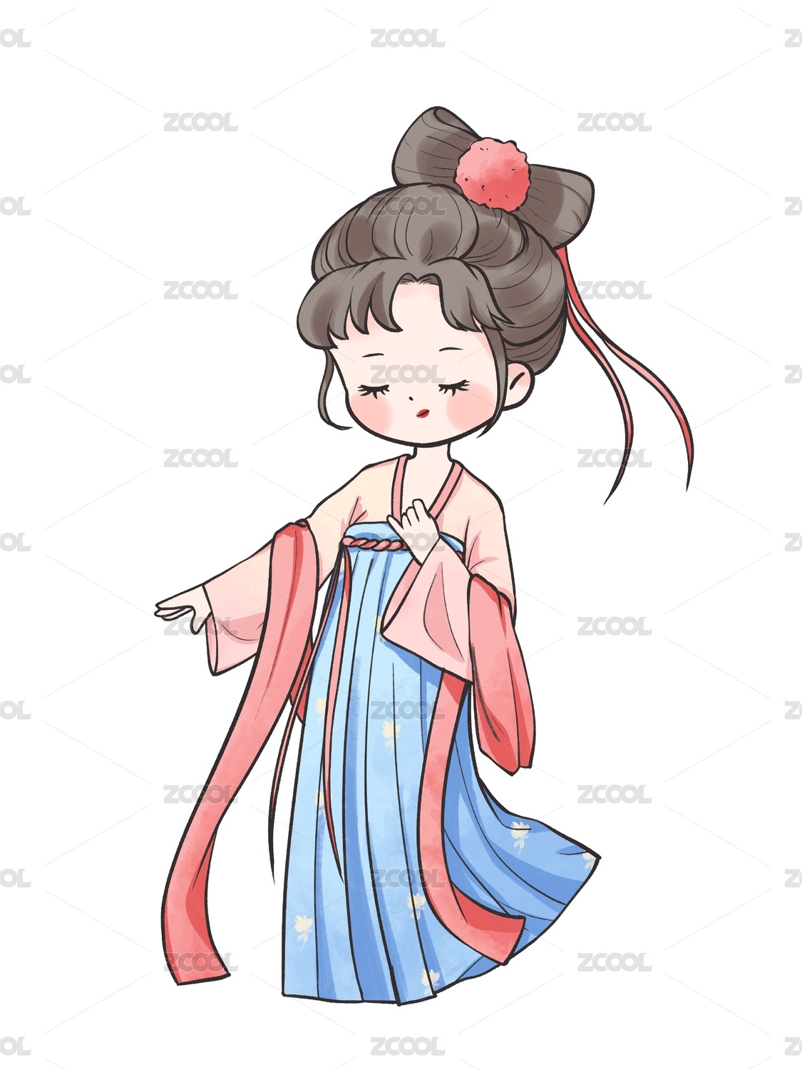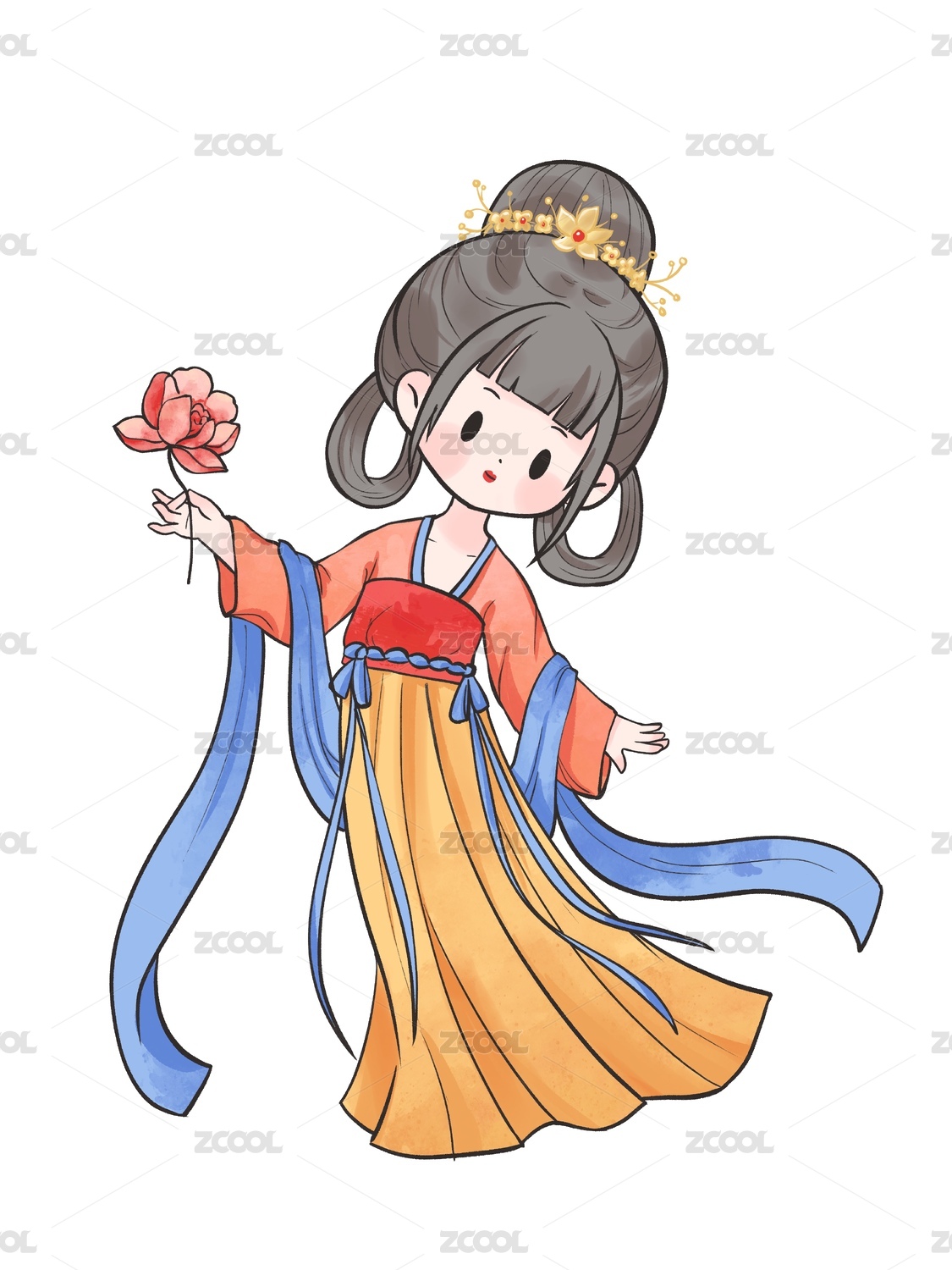 古风手绘Q版红色汉服女孩拿拨浪鼓过年