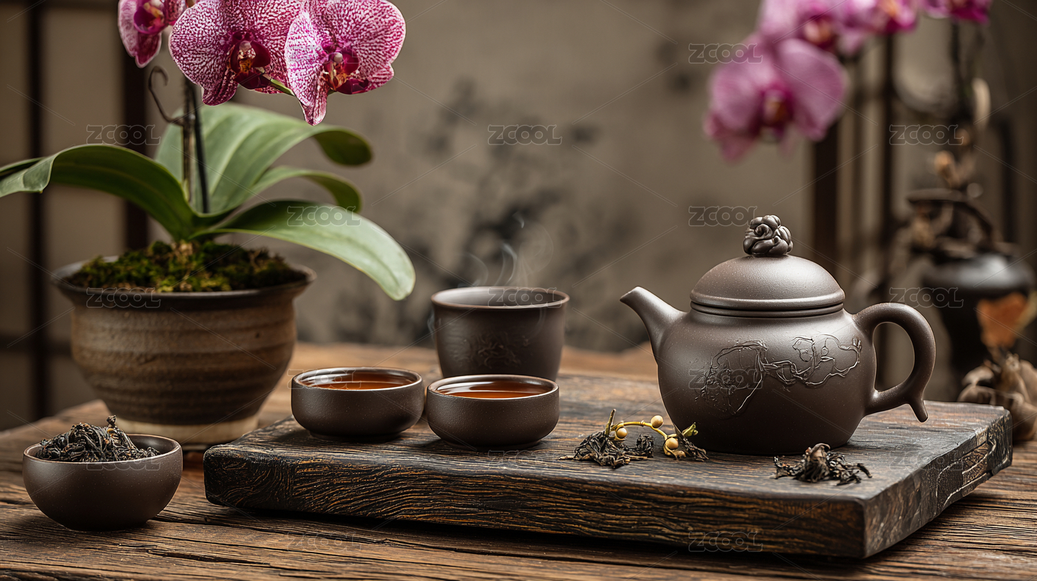 陶瓷茶具和袅袅飘散的沉香烟雾