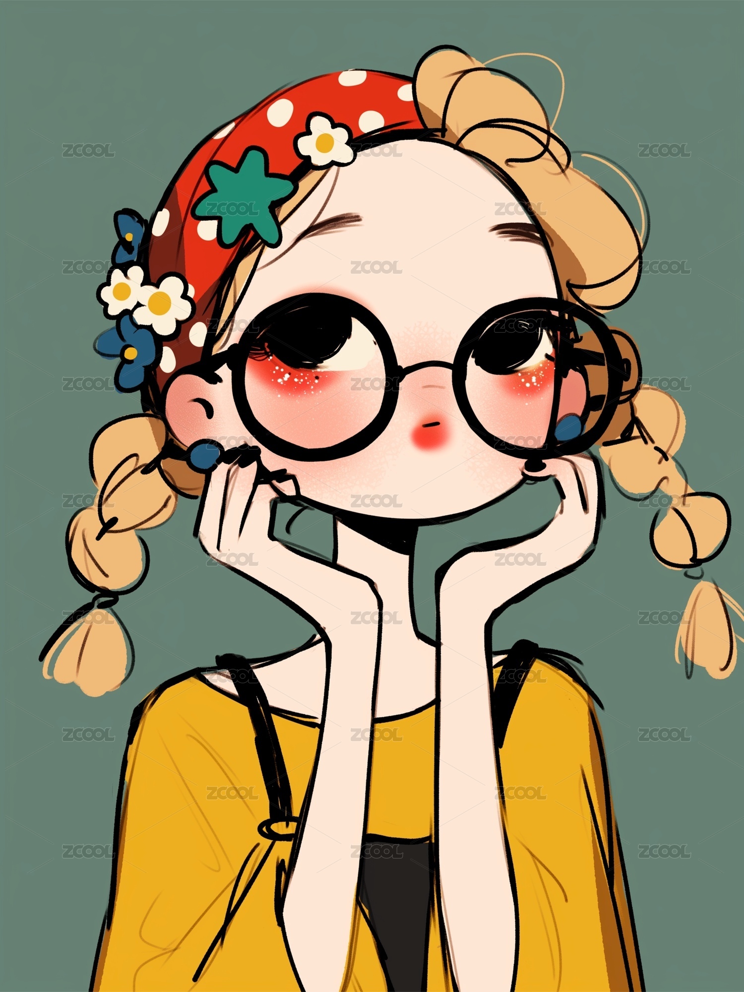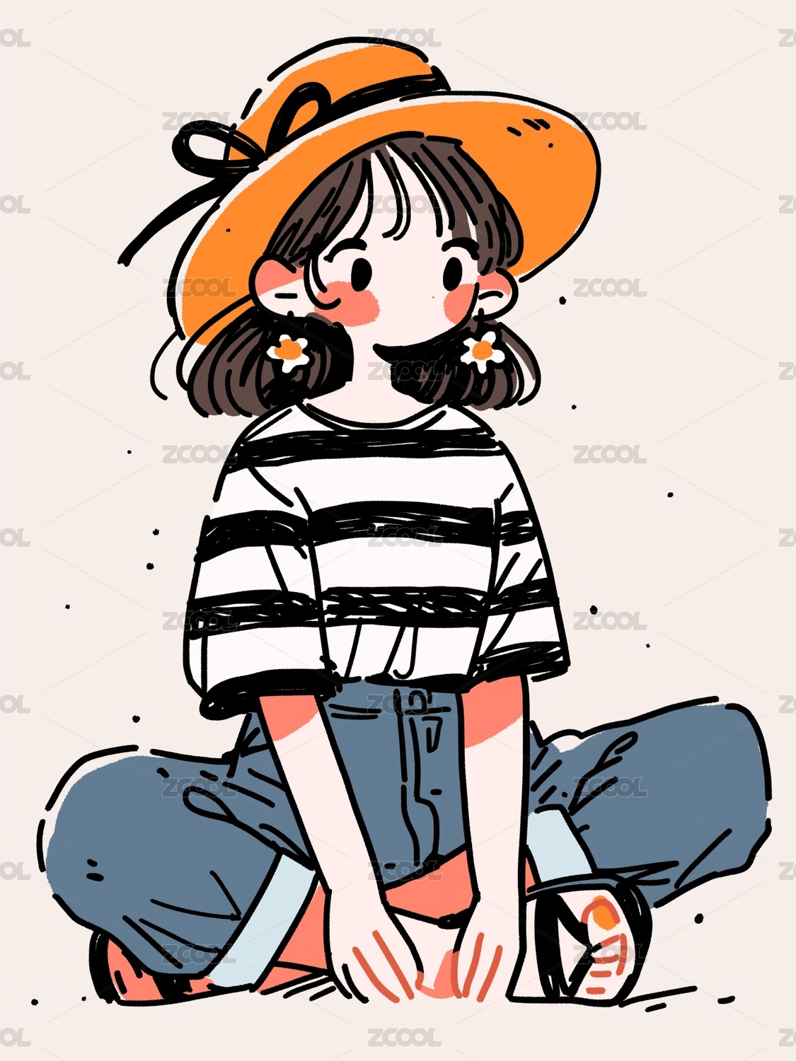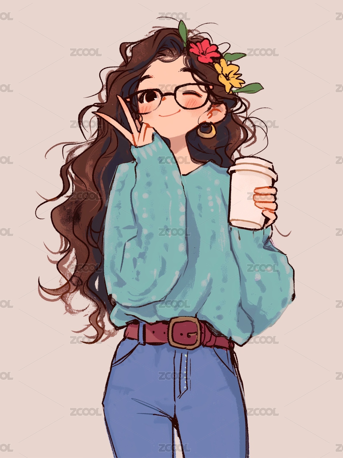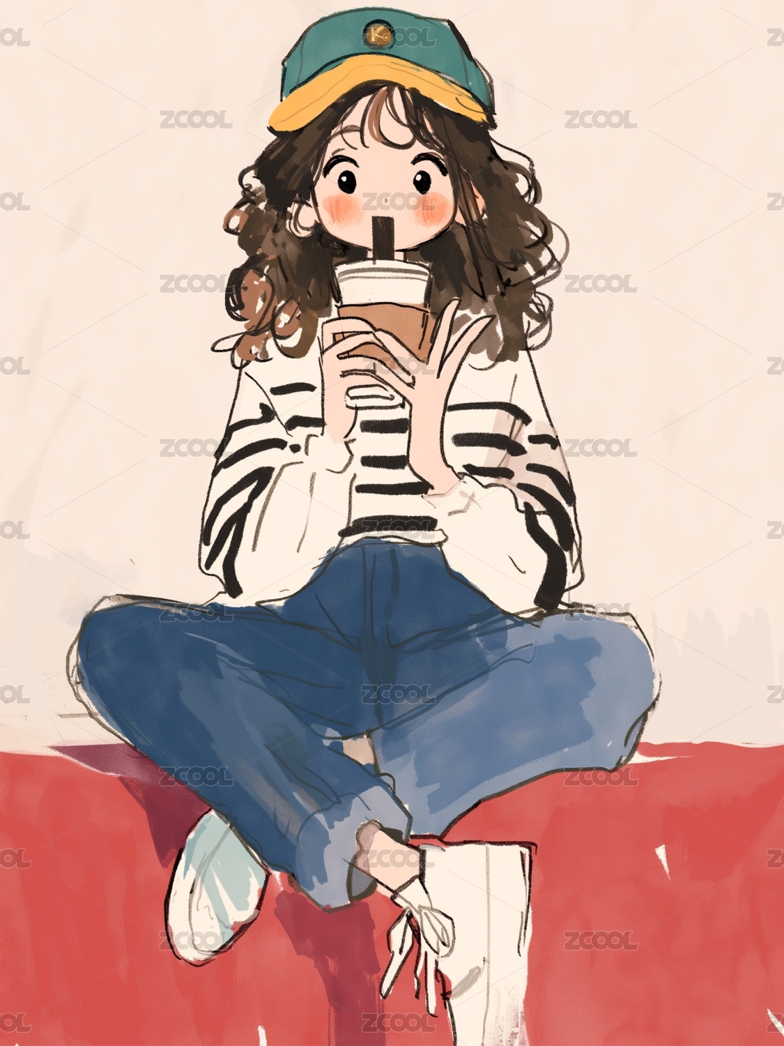 咖啡,女孩,插画,动物,棒球帽,休闲