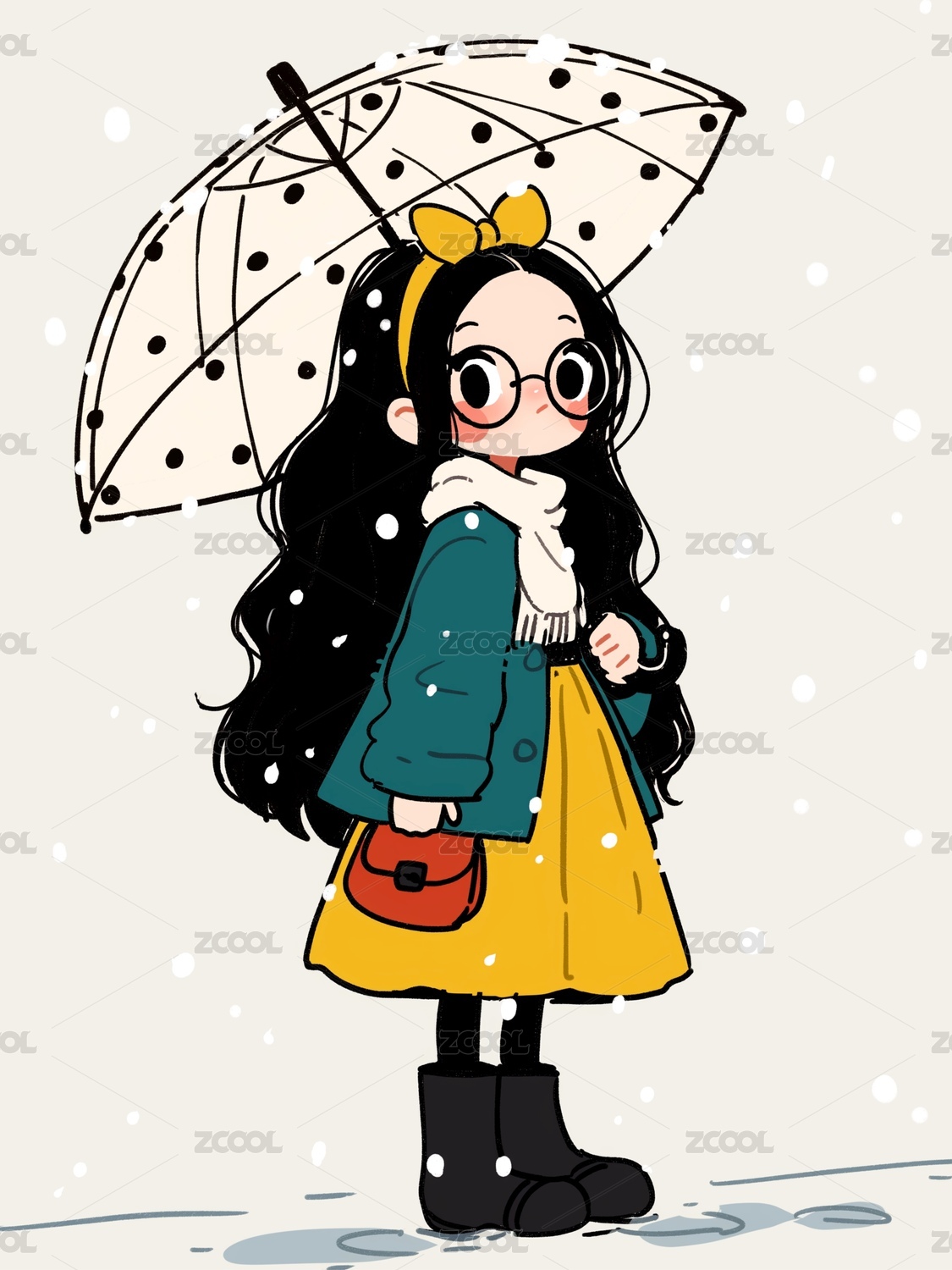 雨伞,女孩,下雪,冬天,插画,涂鸦风