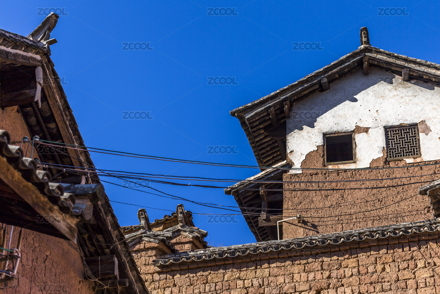 蓝天下云南建水团山古村传统民居瓦檐土掌房