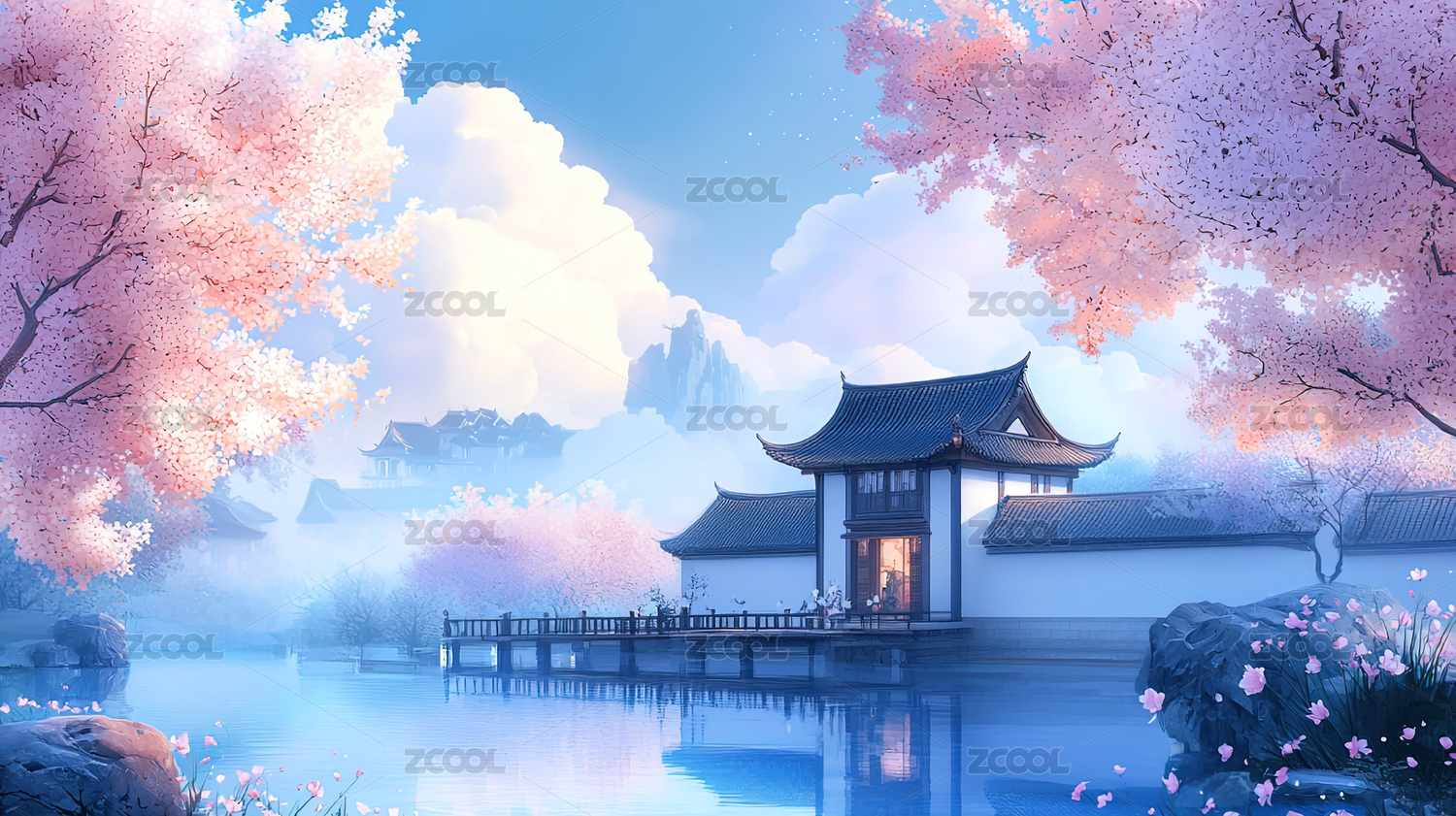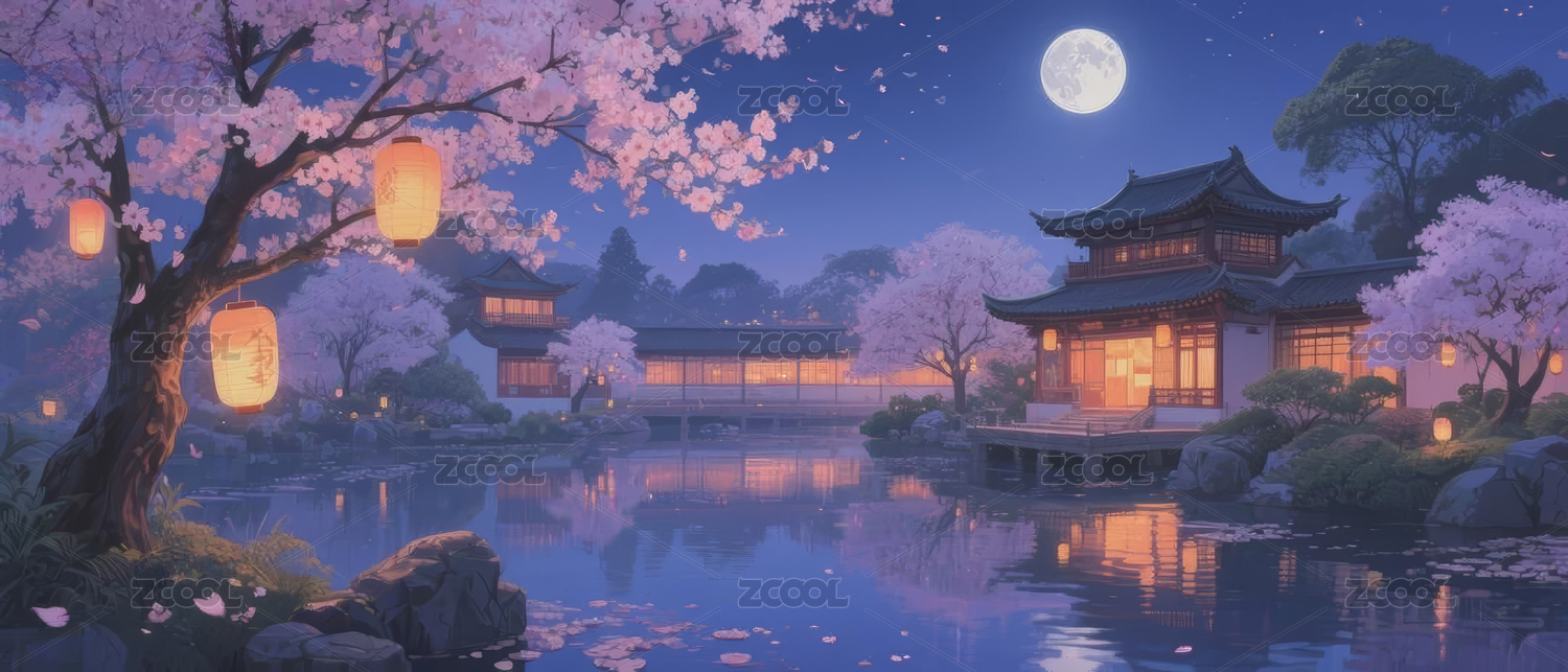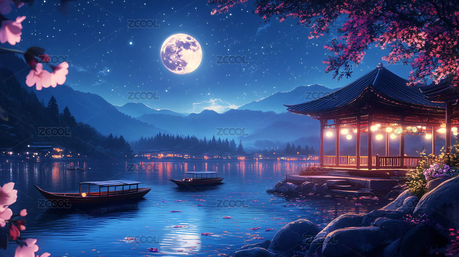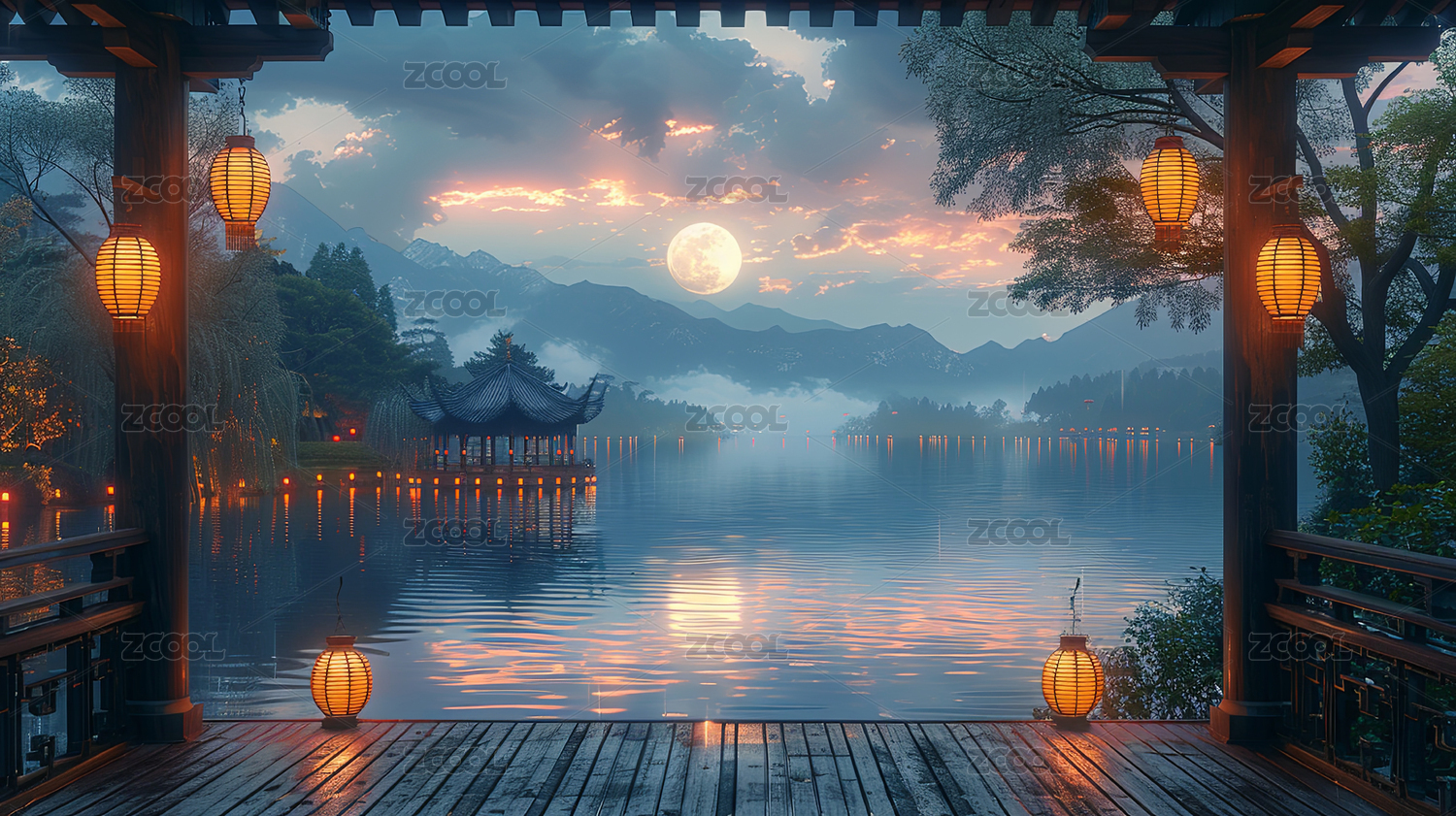 国风中秋月夜中式花窗外的皓月花好月圆素材