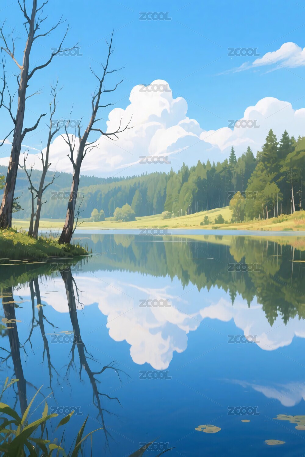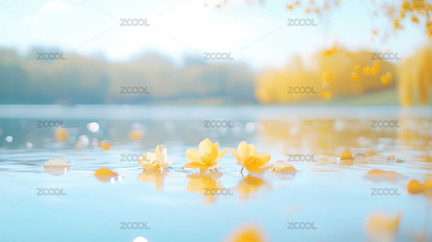 秋季湖泊金黄树叶自然风景治愈壁纸插画