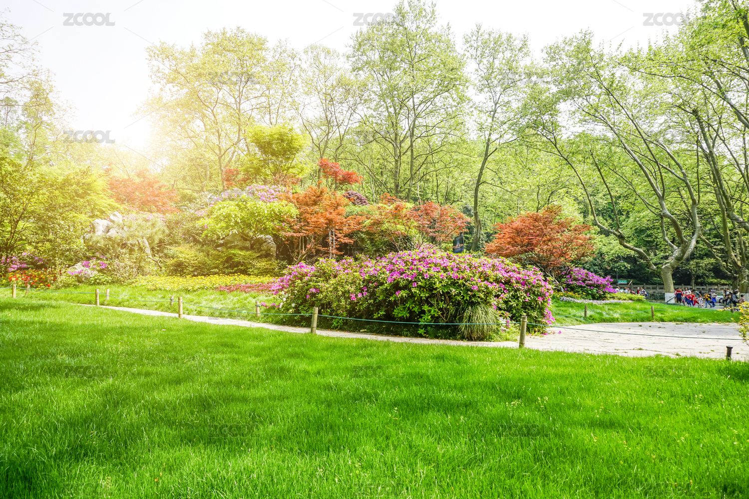 公园春天自然景观茂盛的树林和盛放的锦秀杜