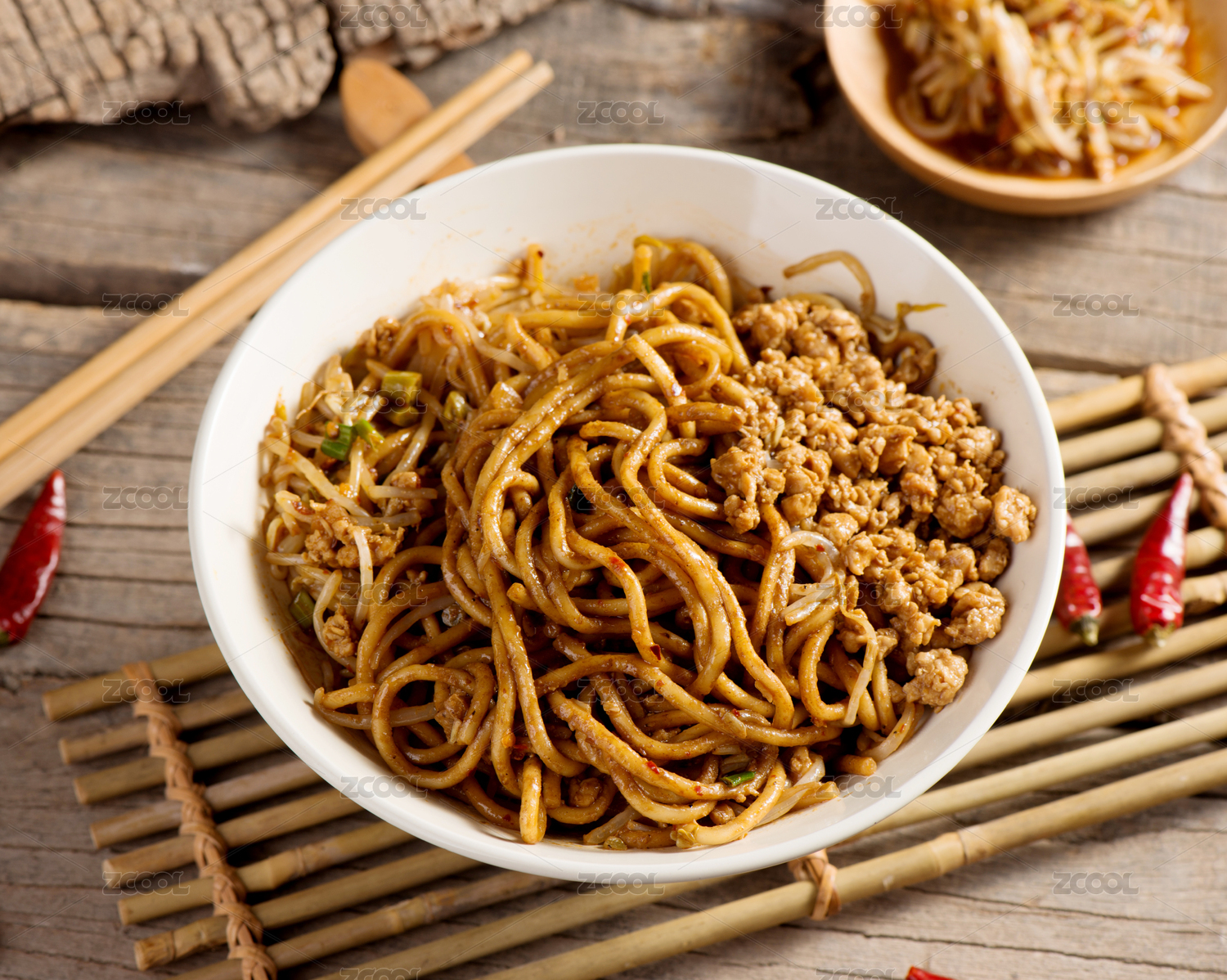 一碗武汉特色小吃热干面摆放在木桌面上特写