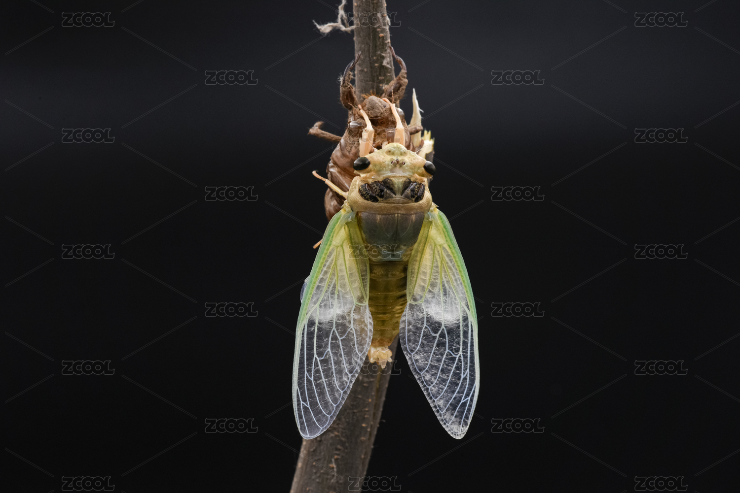 蝉,知了,蜕壳,树枝,黑色背景,蛁蟟,夏季,夏天,动物,野生动物