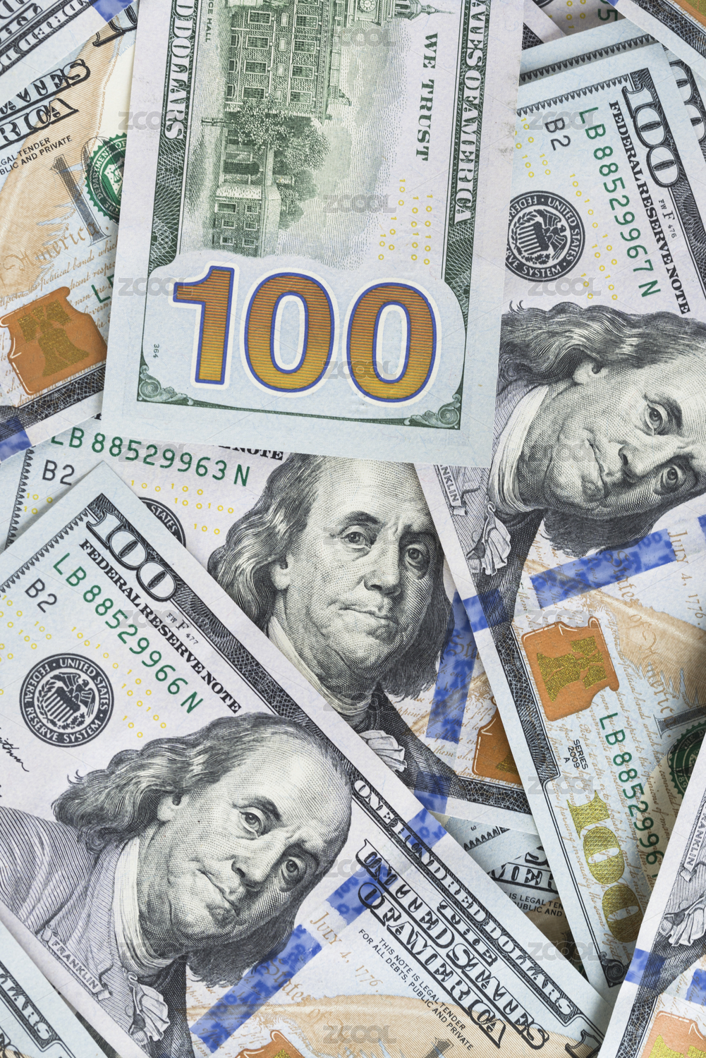 平面排列的100美元纸币