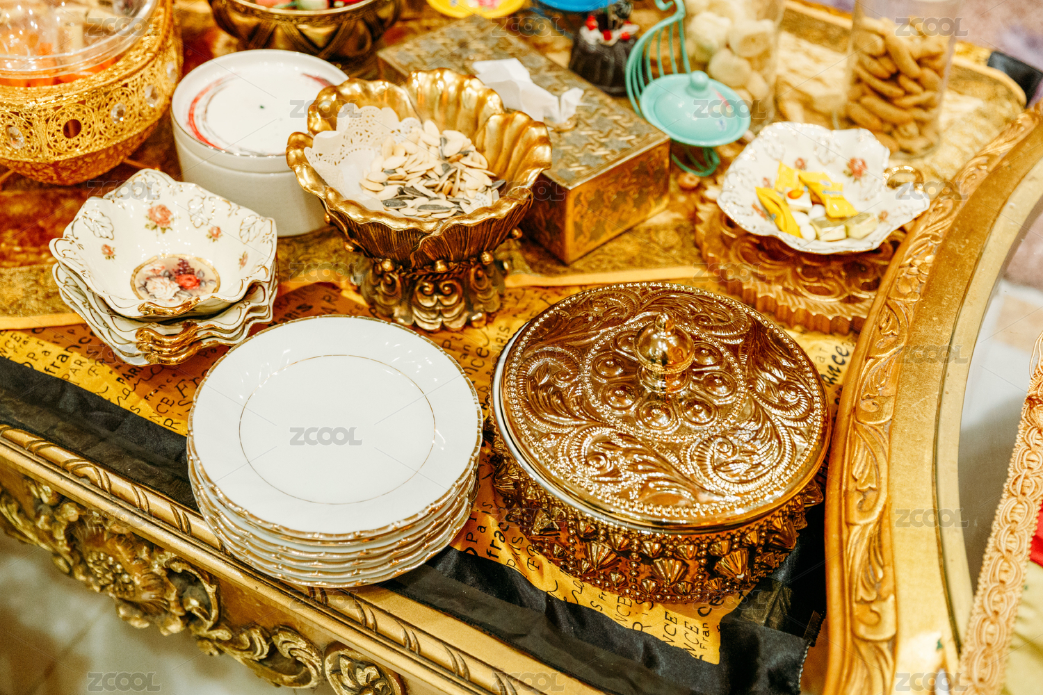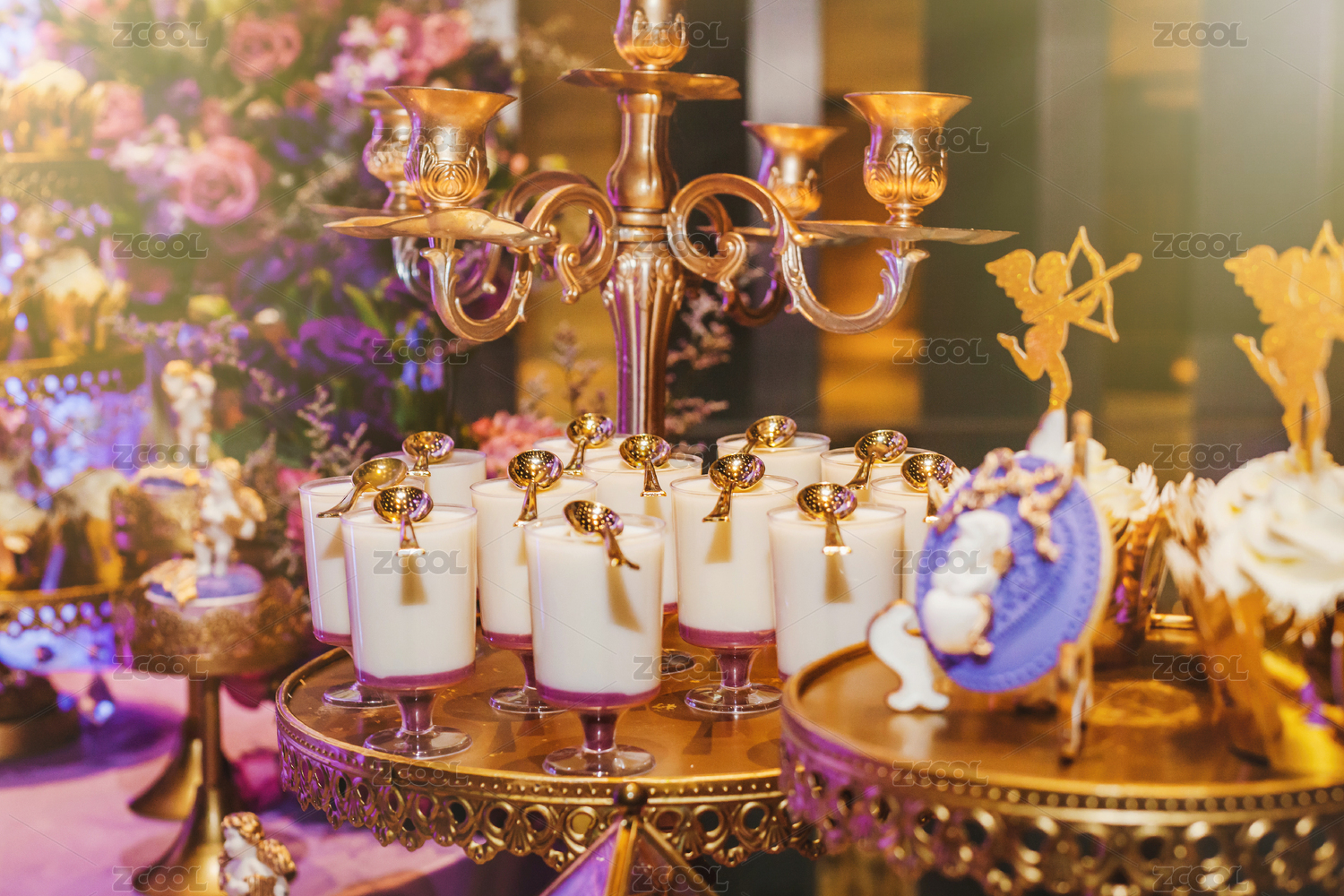 金色托盘上的布丁和饼干,欧式奢华甜品。