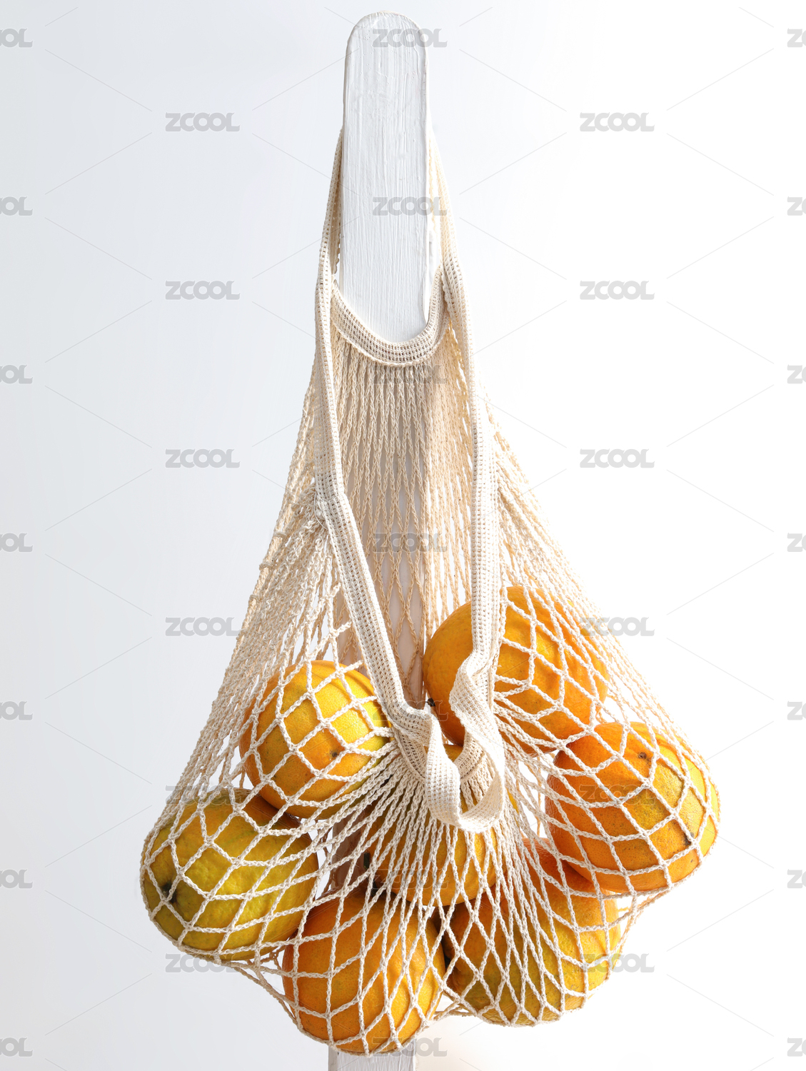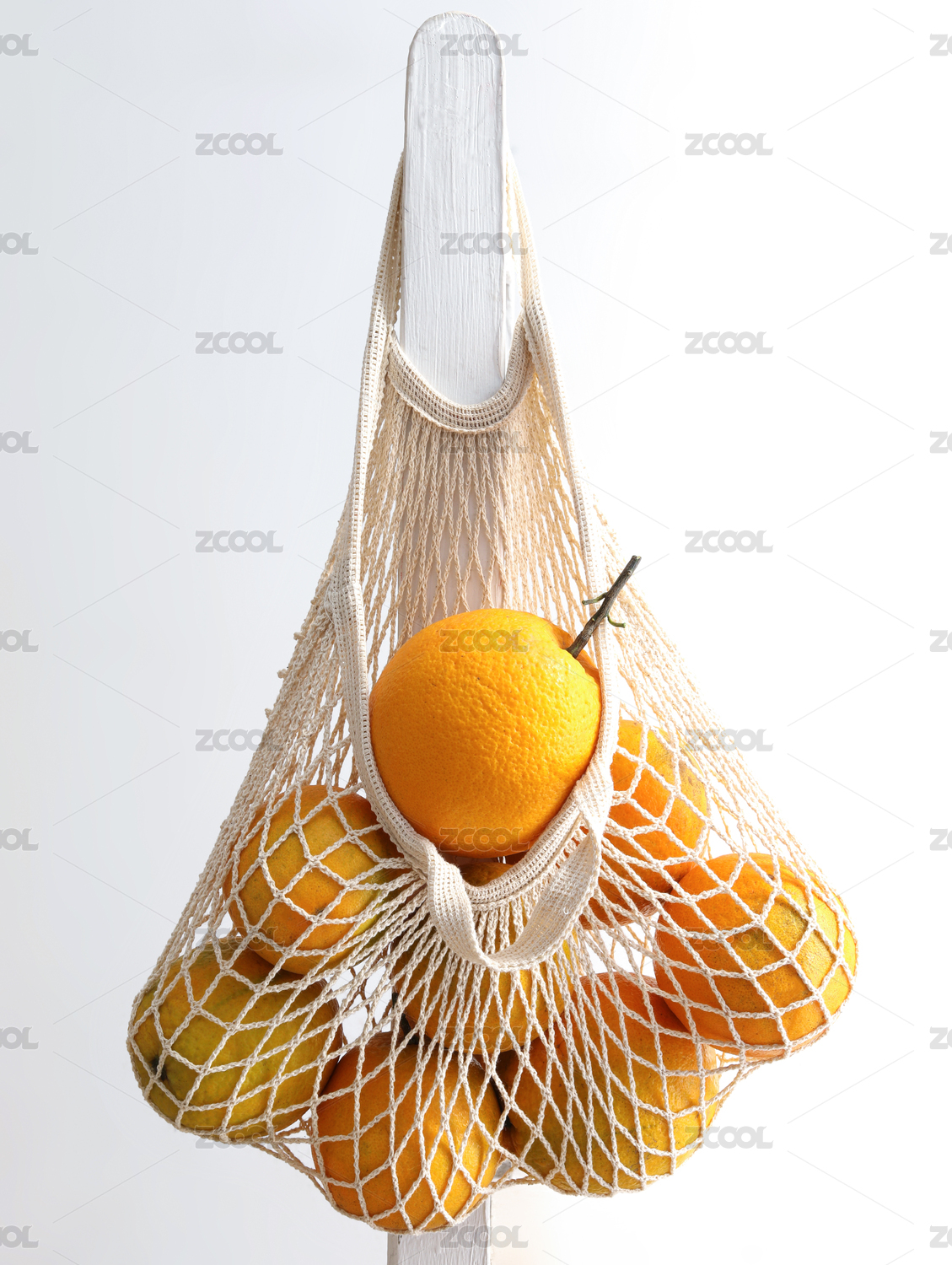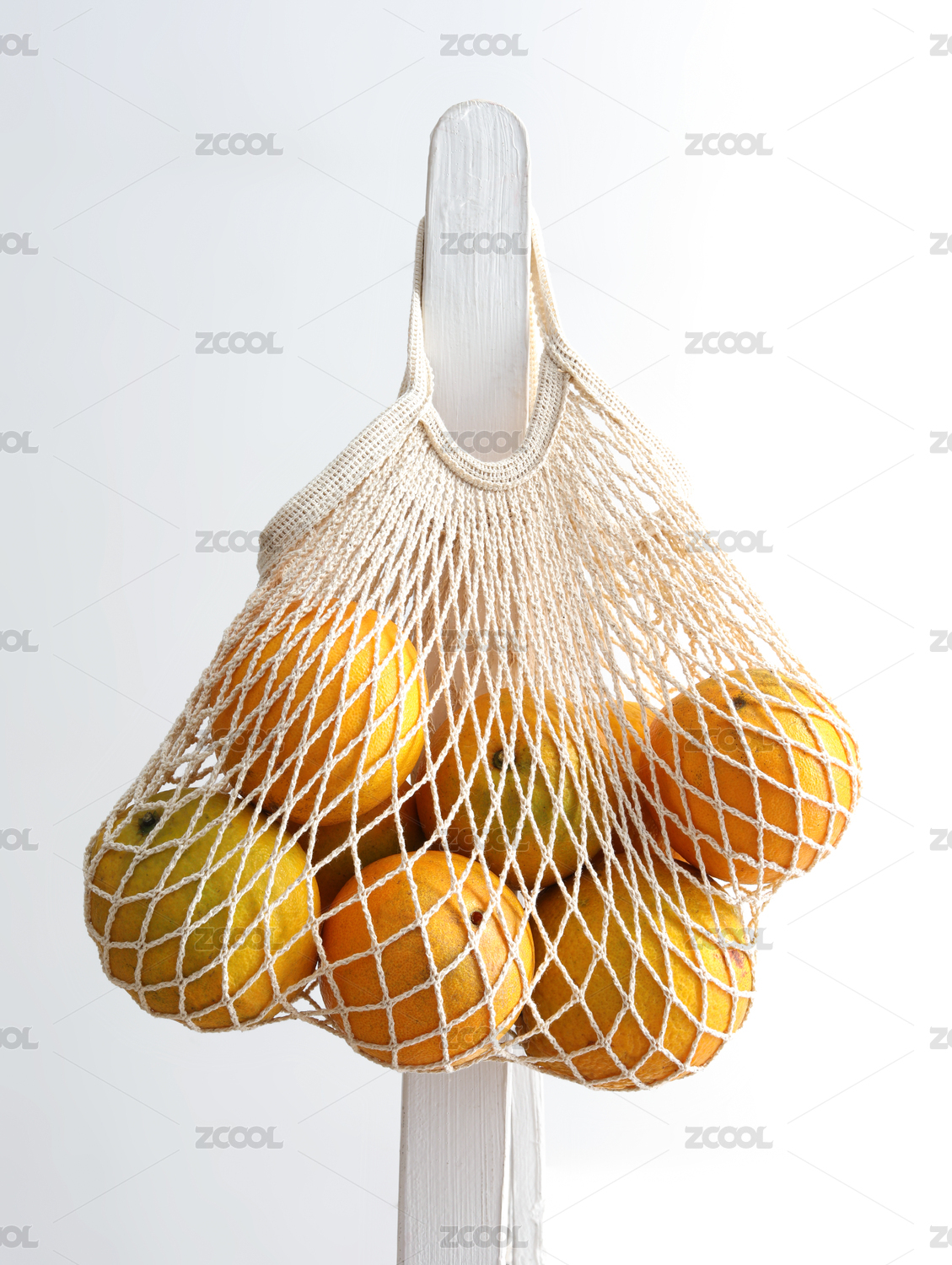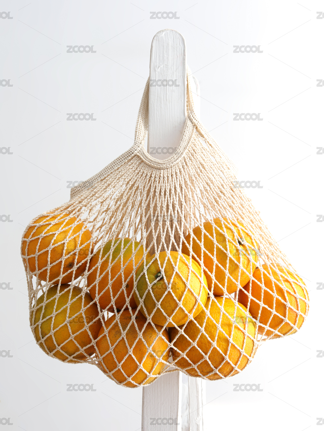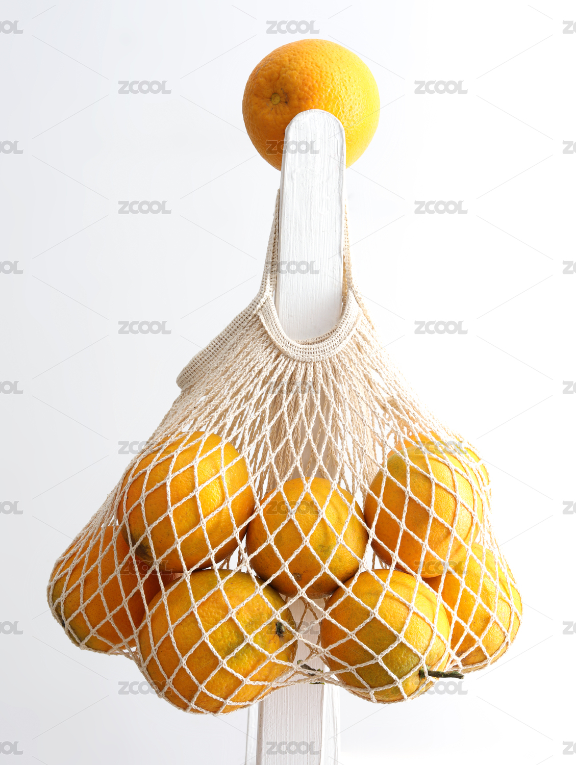 白色椅子上挂着一袋子新鲜的水果橙子脐橙