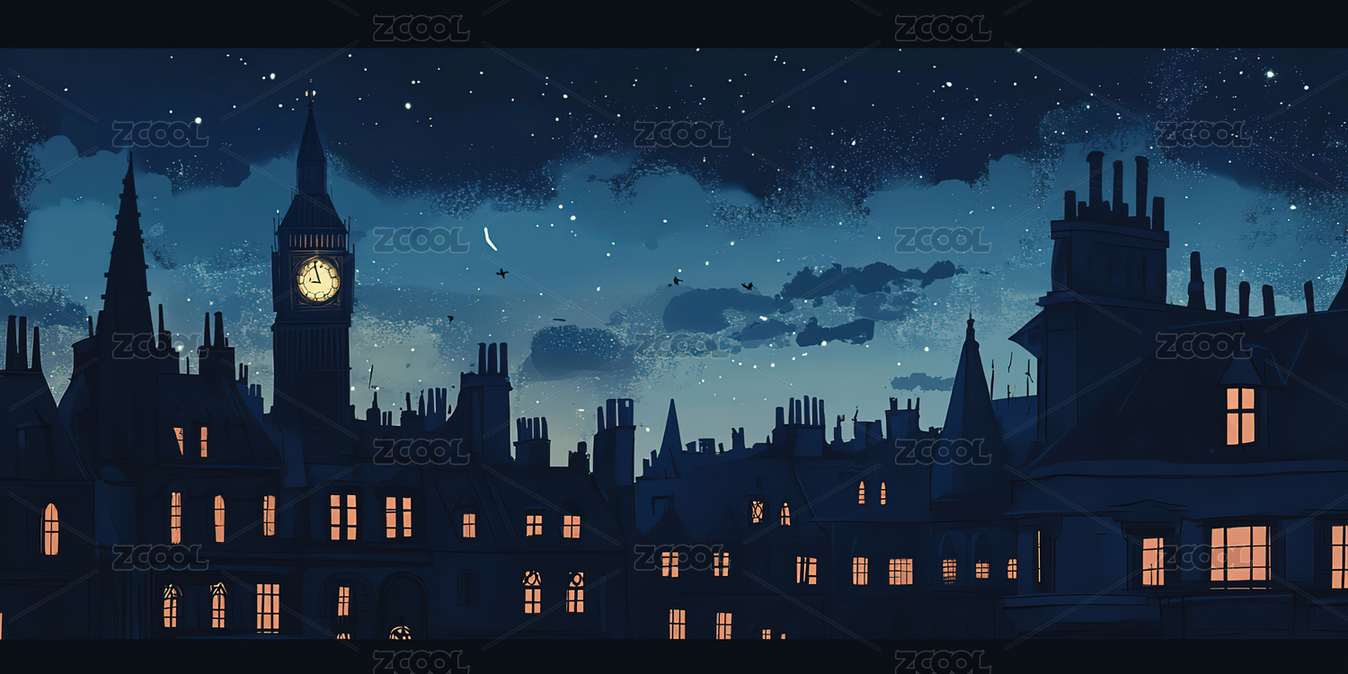伦敦天际线插画:大本钟,塔桥和碎片大厦