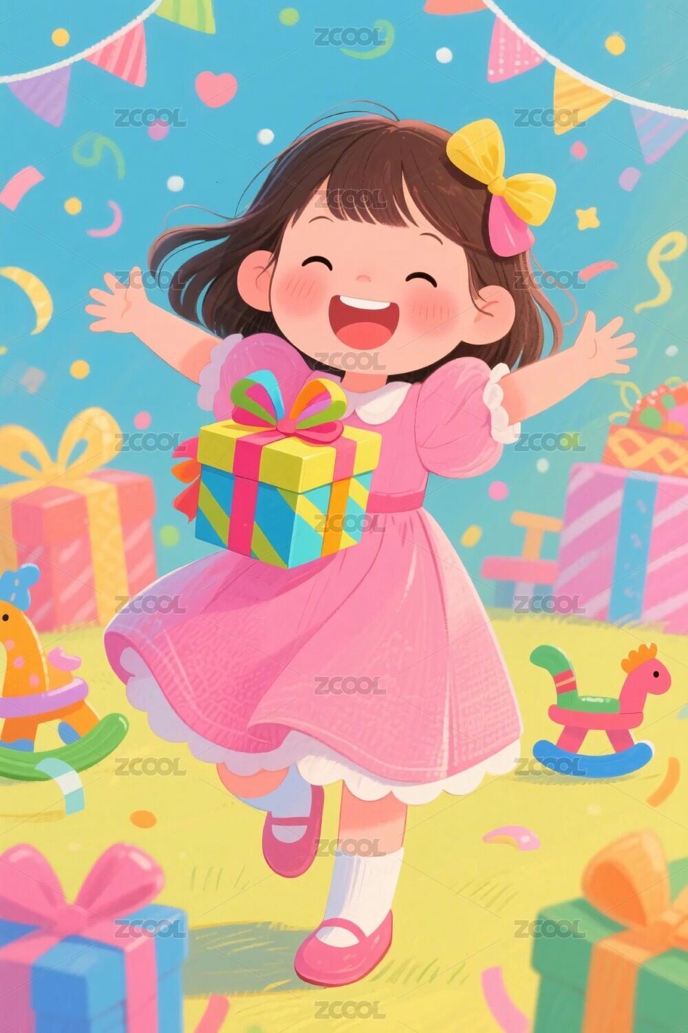 六一儿童节女孩收礼物插画快乐童年活动海报