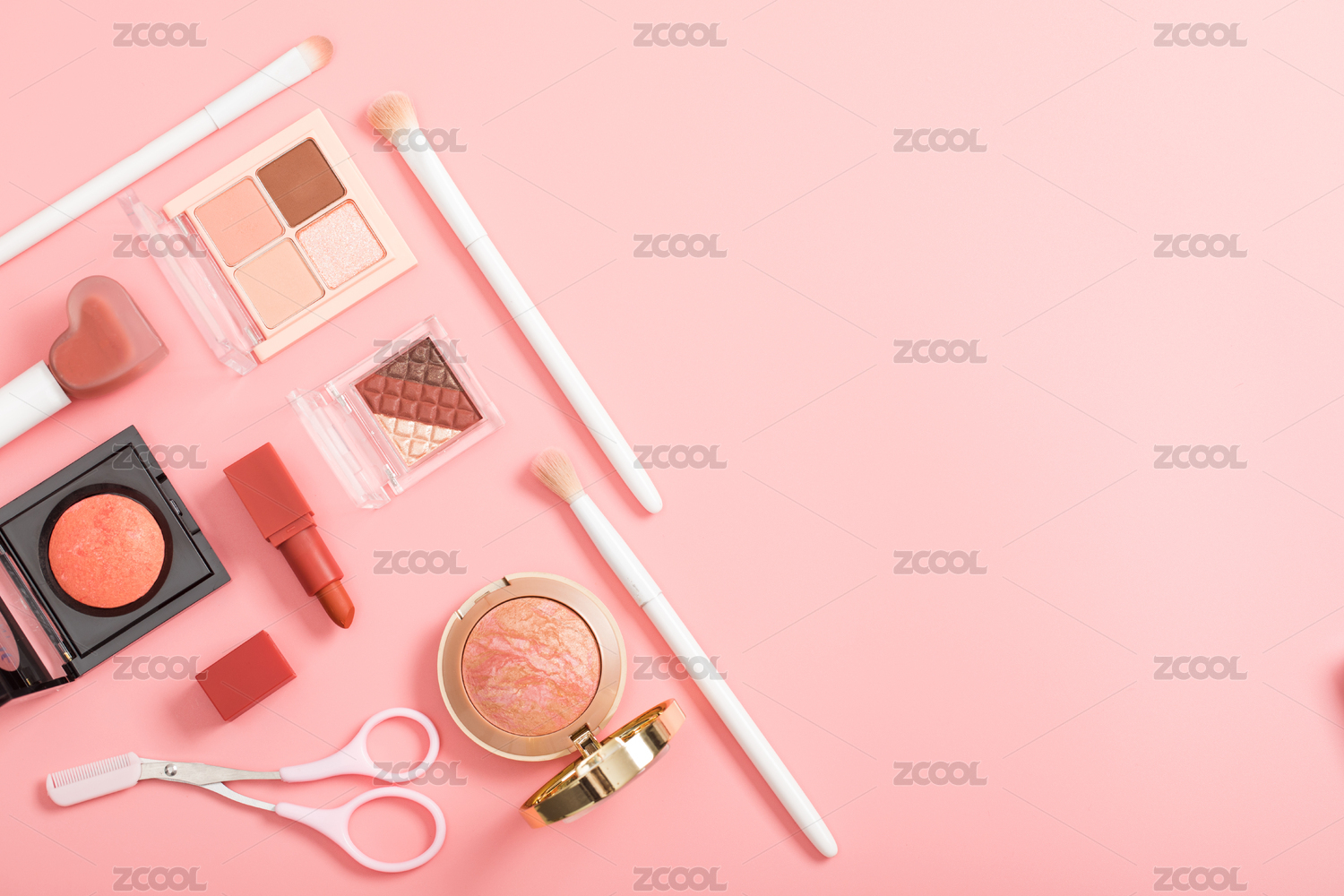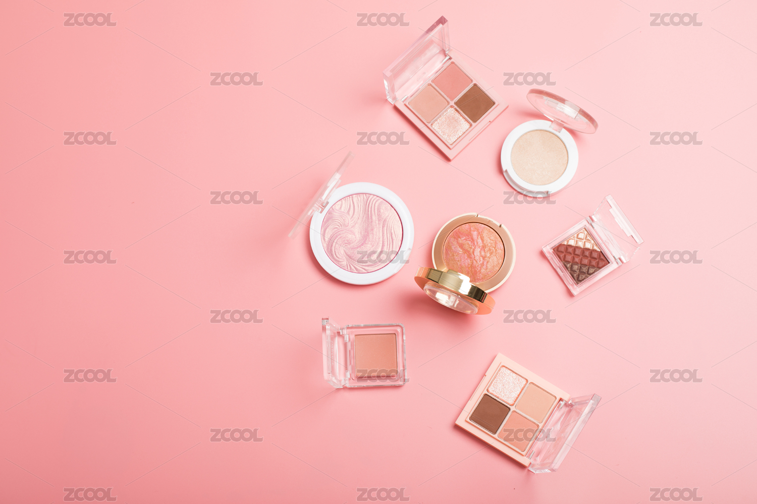 嫩粉色背景上规整摆放着的彩妆产品