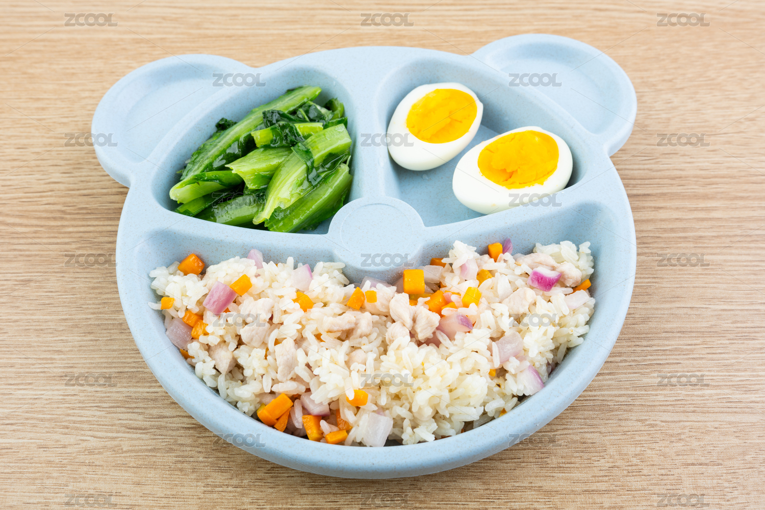 白背景上一盘儿童营养餐,牛肉烧土豆配米糕