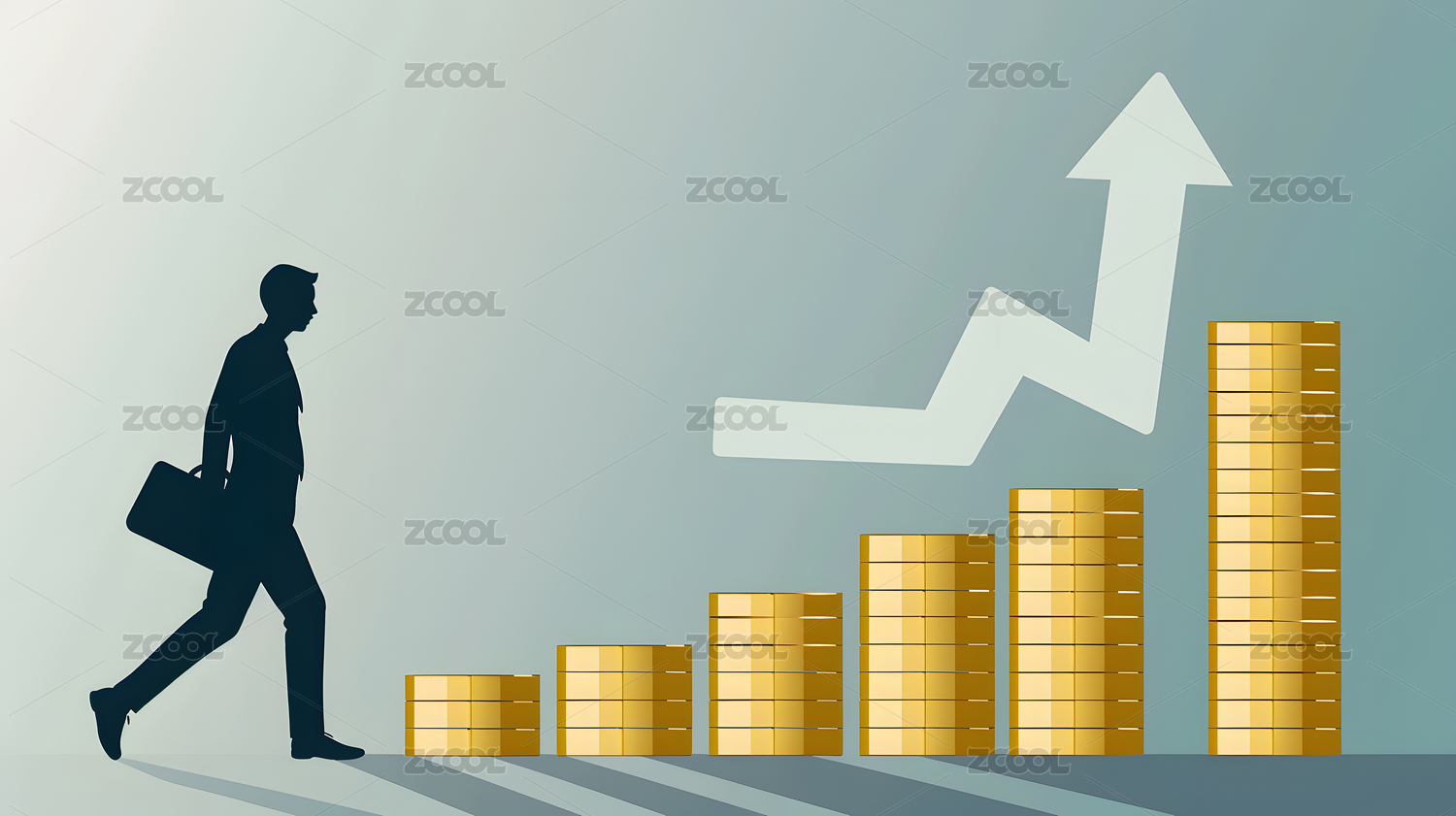 商务人士走过递增金币堆且旁有上升箭头