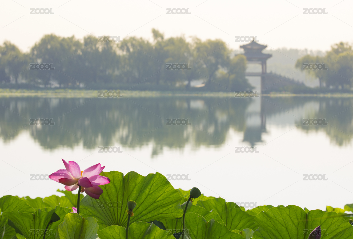 一个古亭荷花池塘风景