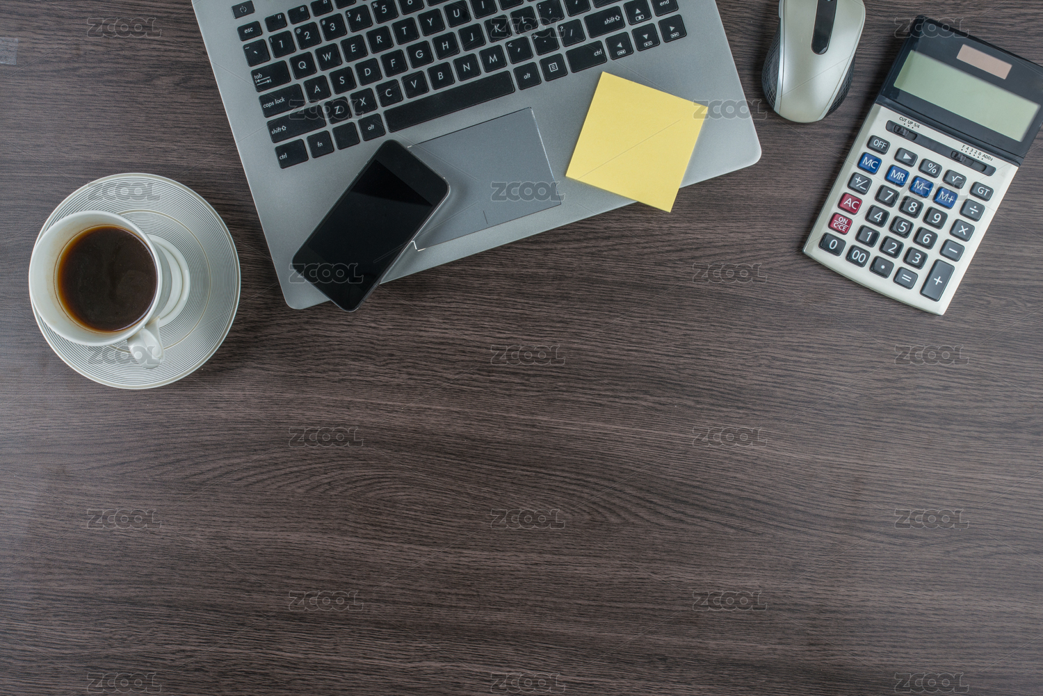 正上方视角特写书桌上放着笔记本电脑,眼镜,智能手机和咖啡