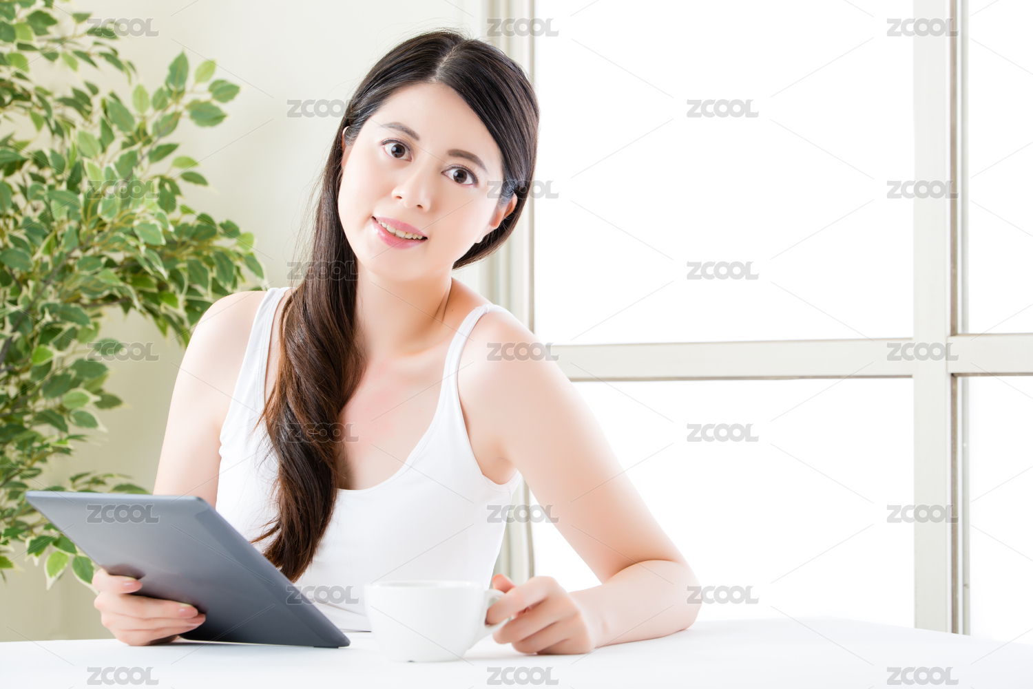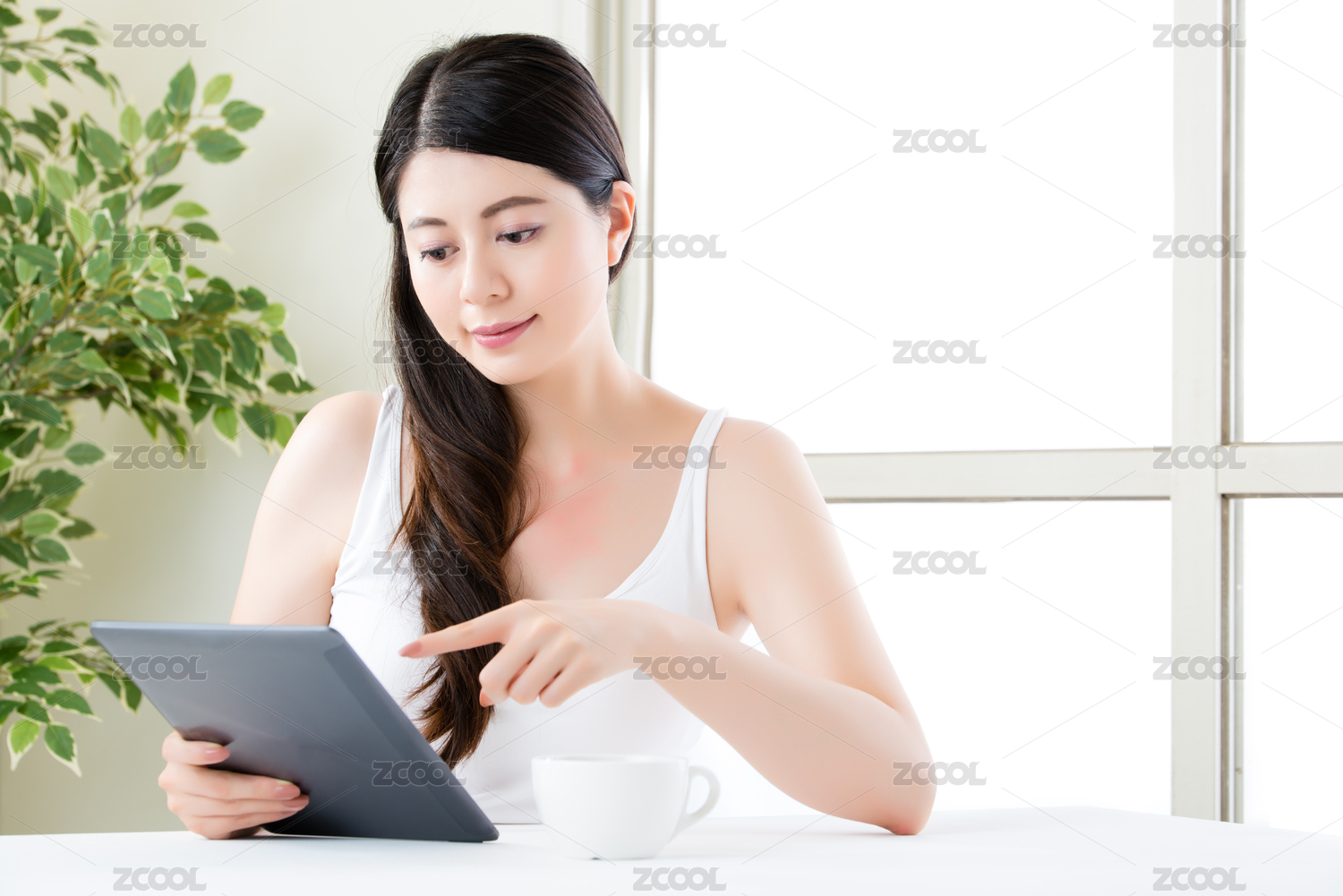 美丽的亚洲女子使用数字平板电脑和喝咖啡,健康食品概念