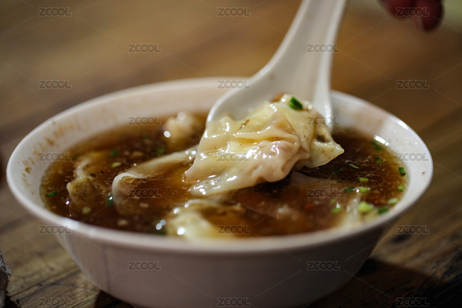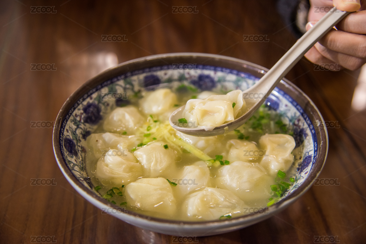 调羹从一碗小馄饨里捞起一个小馄饨的特写