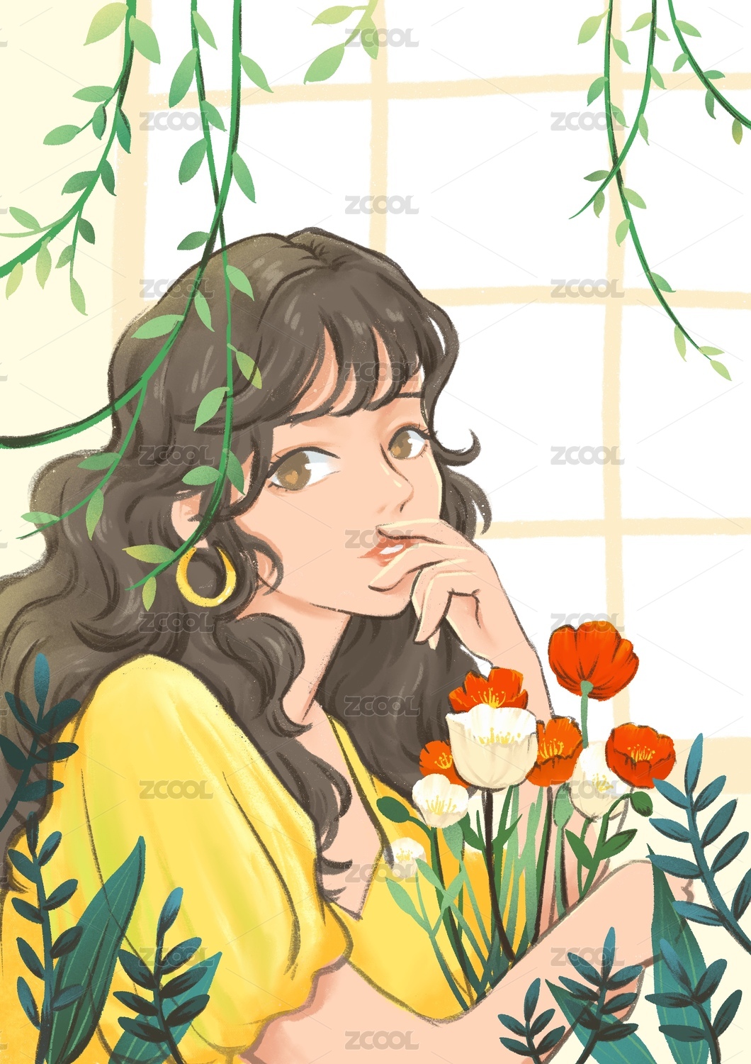 花从中的小清新女孩插画