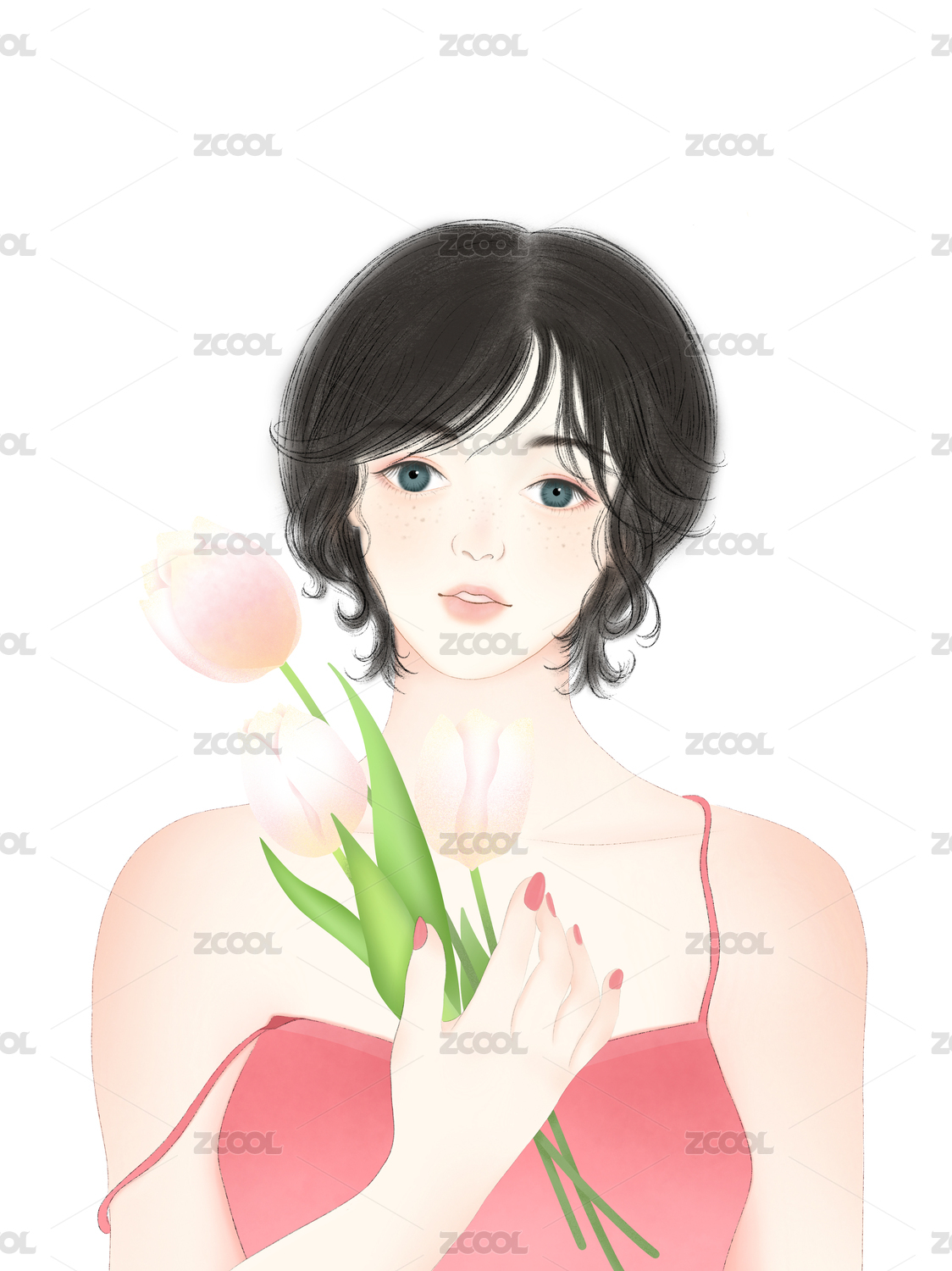 粉色郁金香人物手绘