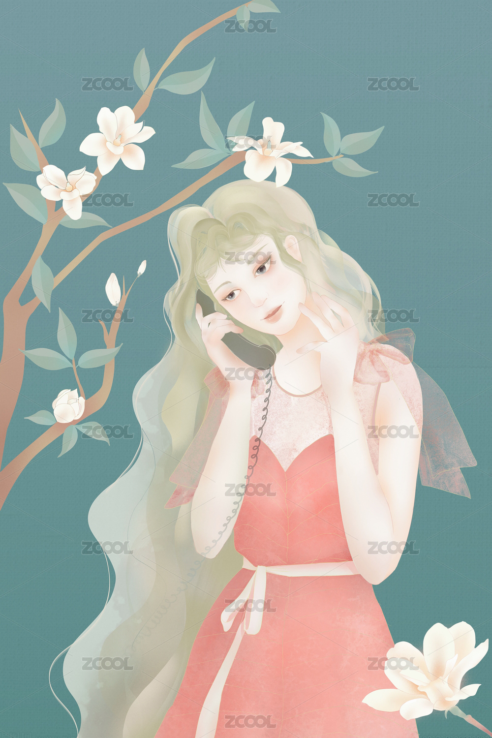 在玉兰花下打电话的长发少女插画