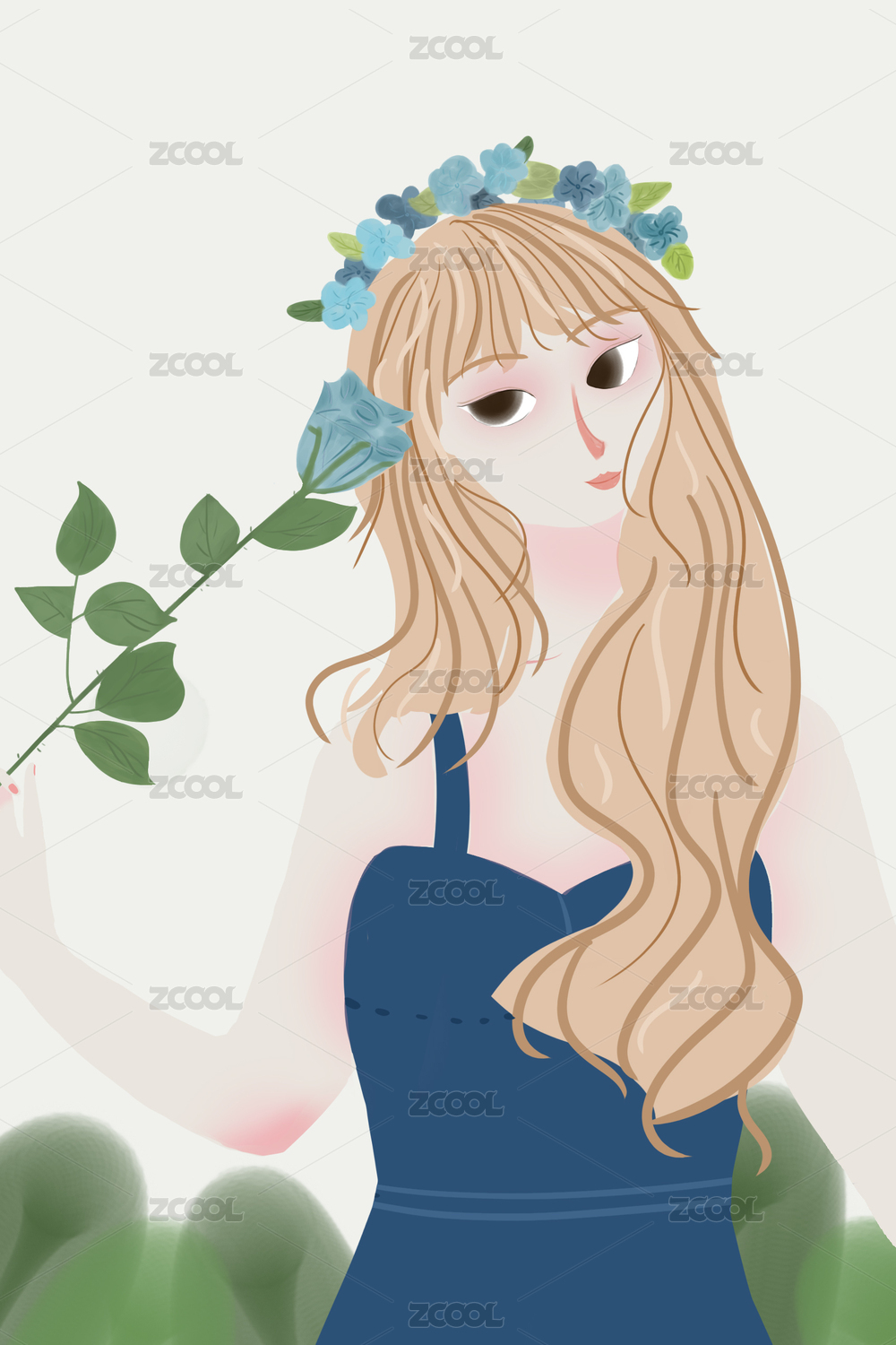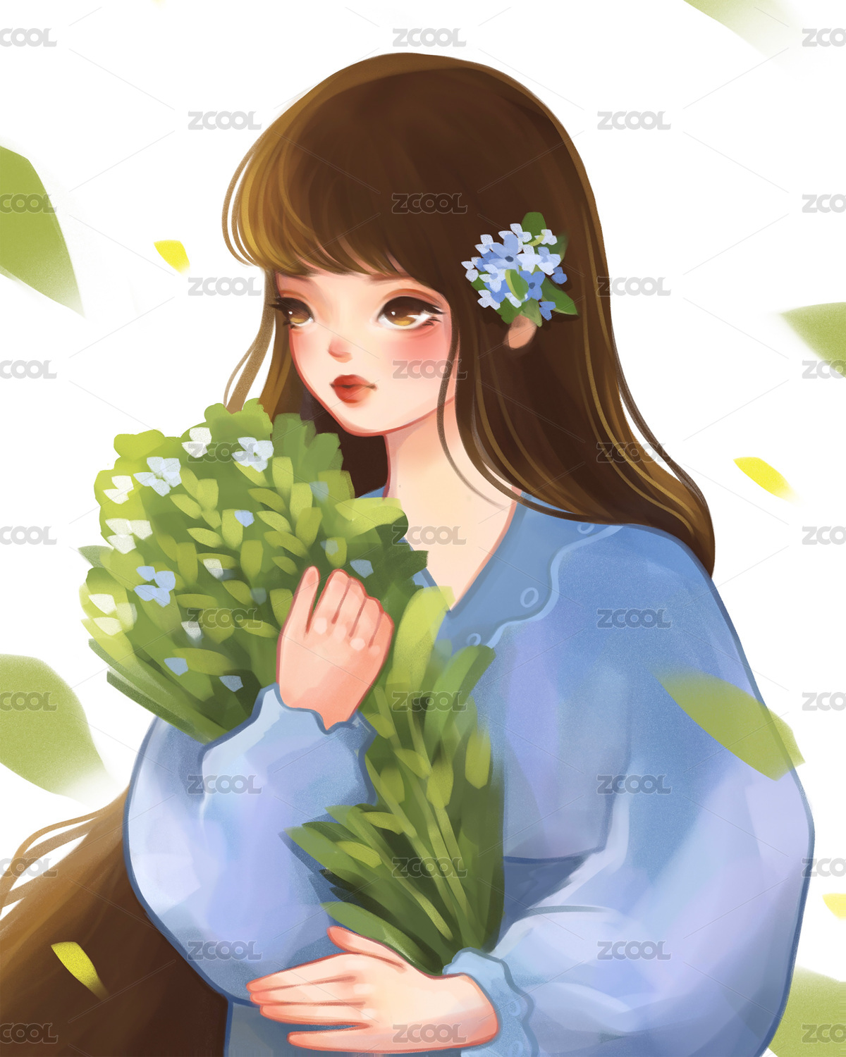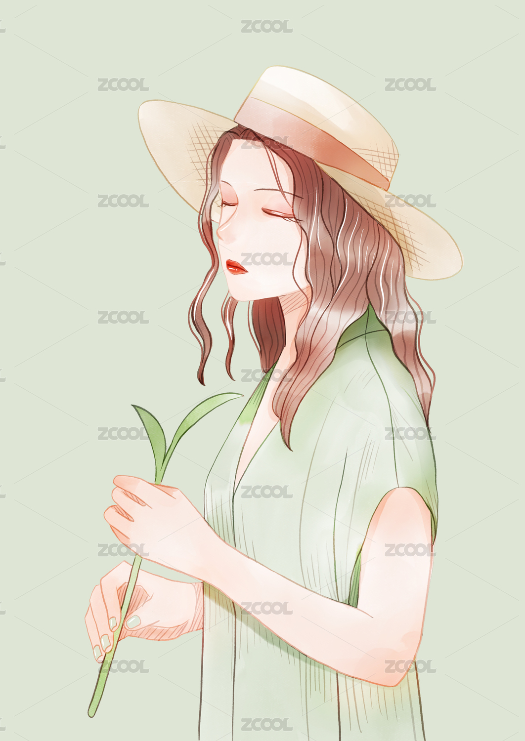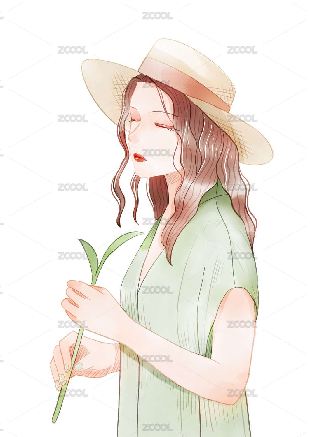 手拿一枝植物的长发文艺少女 手绘插画