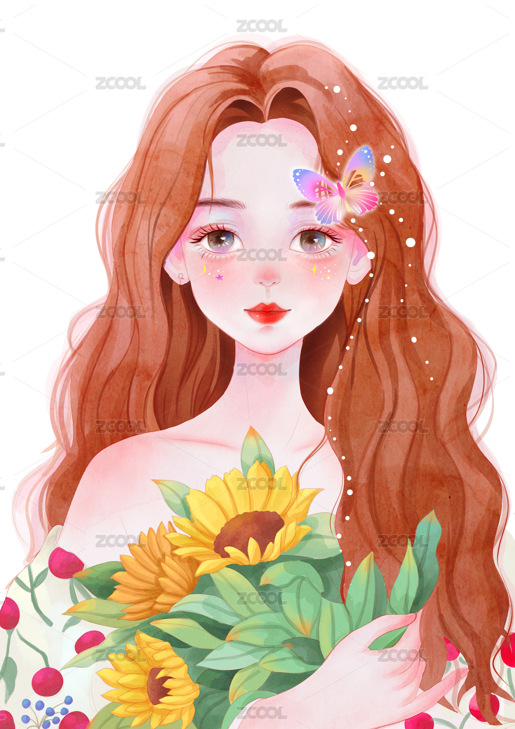花丛中的少女水彩插画