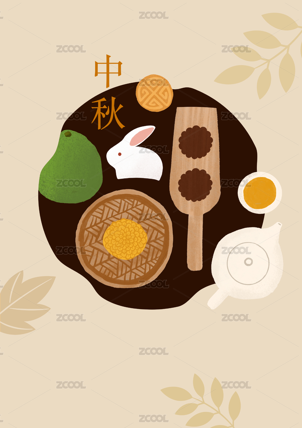 中秋节传统节日矢量插图:玉兔、芋头、筲箕、中秋节食物、水果