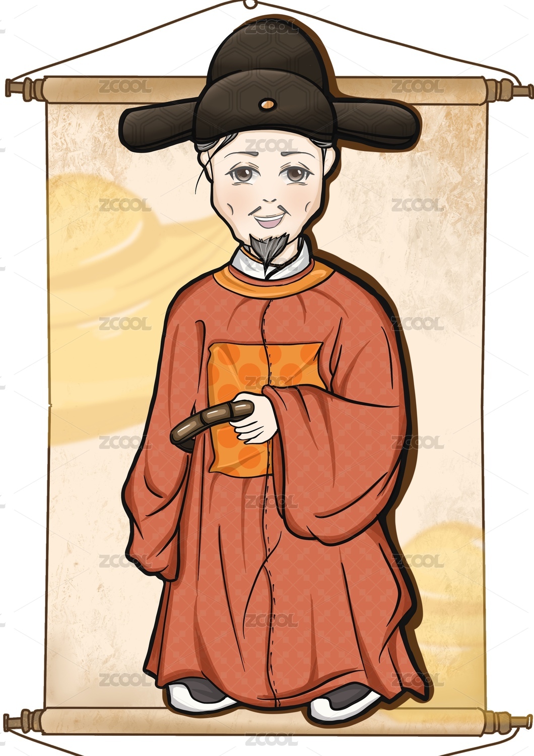 古代人物于谦手拿毛笔头载官帽,手绘插画