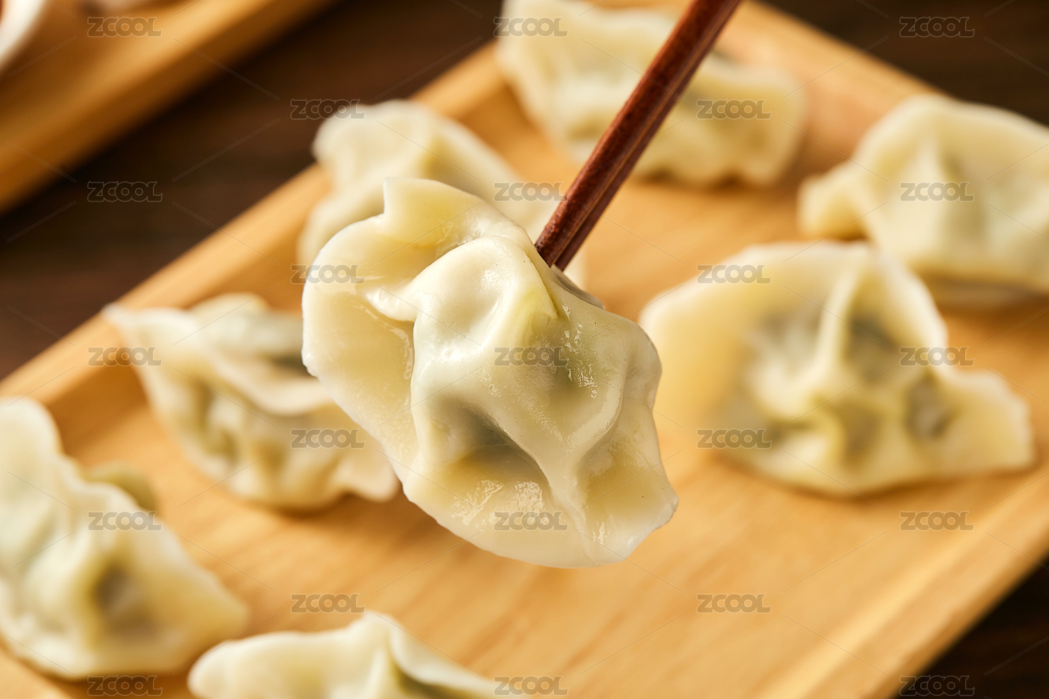 一盘传统美食水饺饺子摆放在窗棂影木桌面上