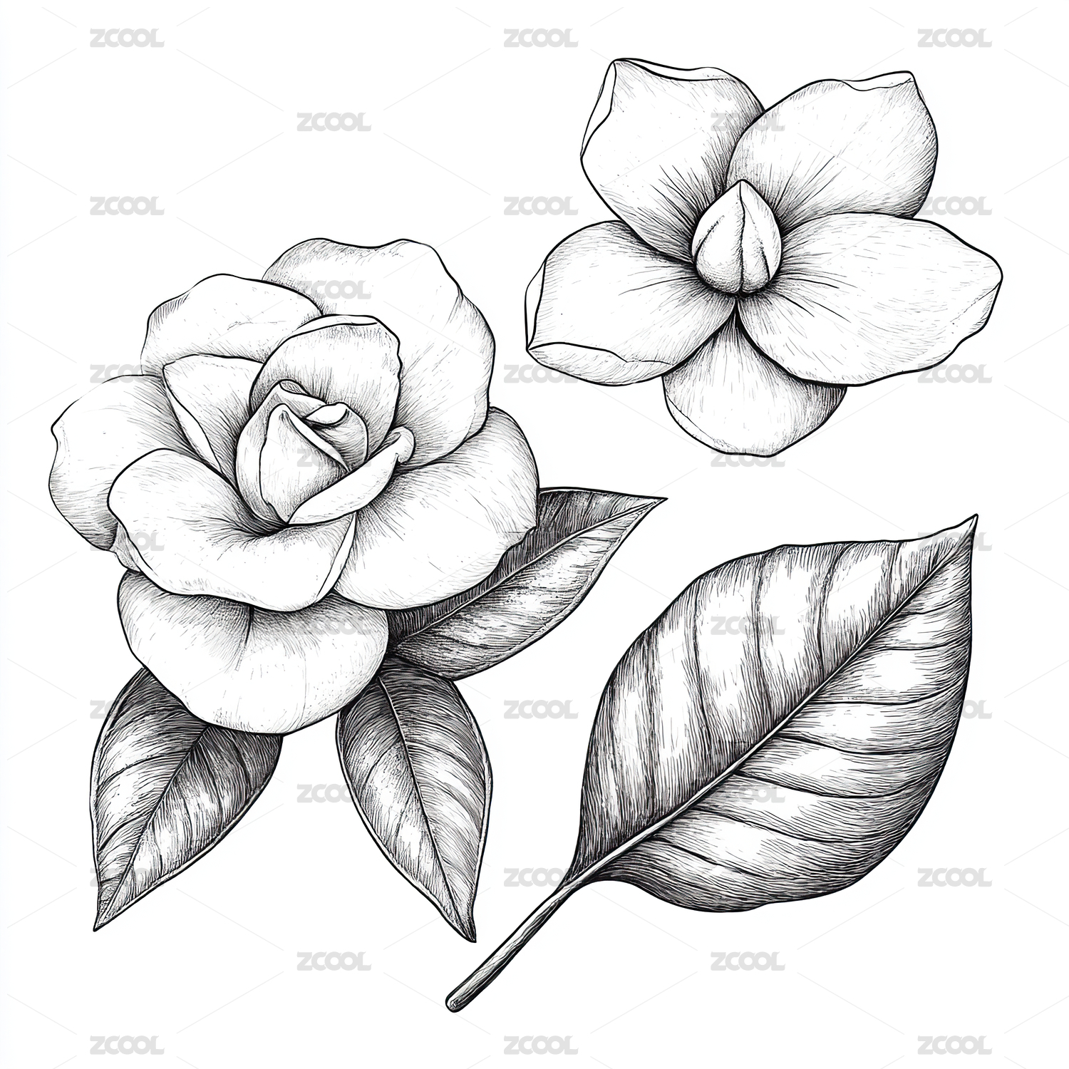 山茶花钢笔版画黑白线描插画