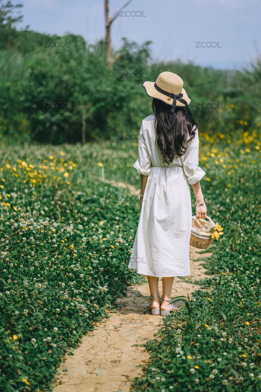田园微风中穿白裙子的清新女孩