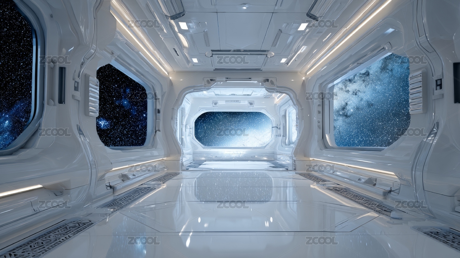 未来宇宙飞船内部宽敞白色通道