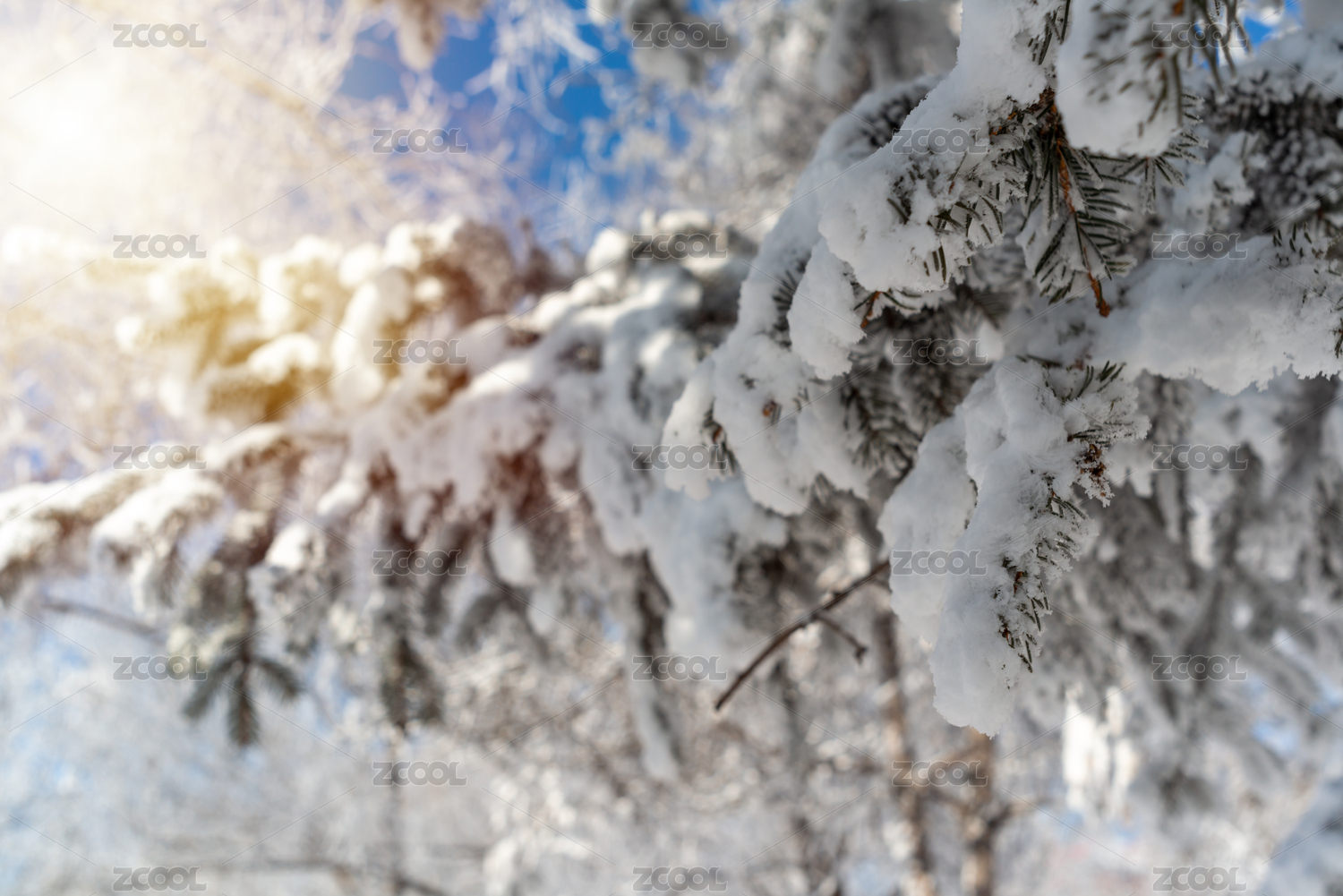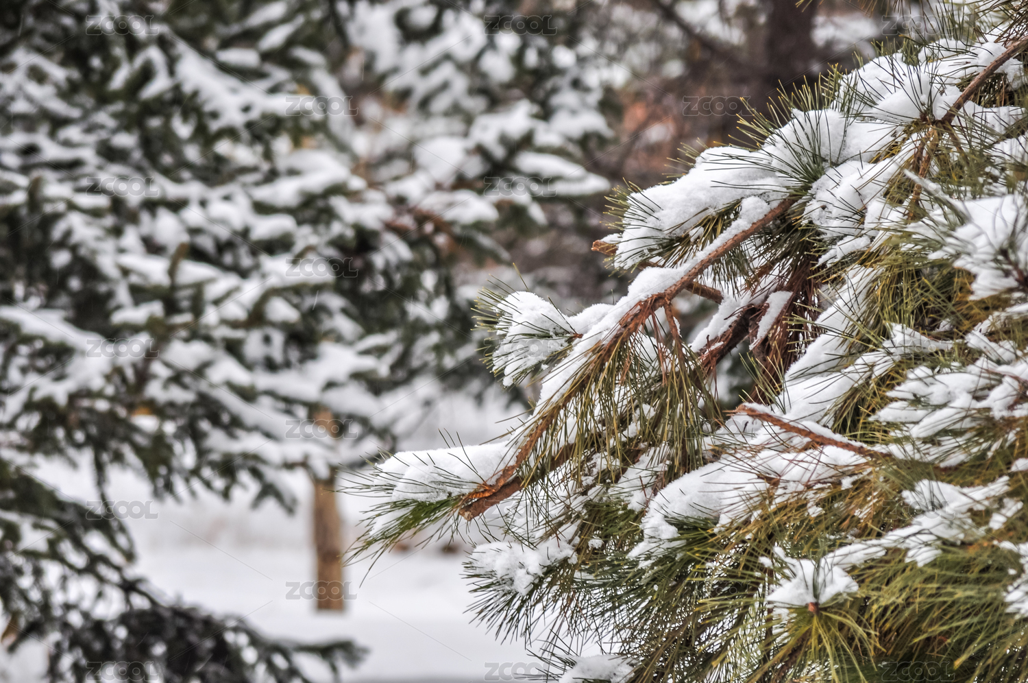 白天松树松针上的雪