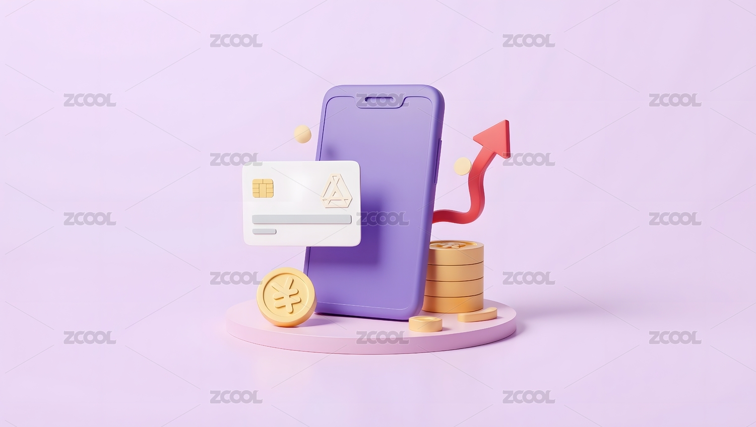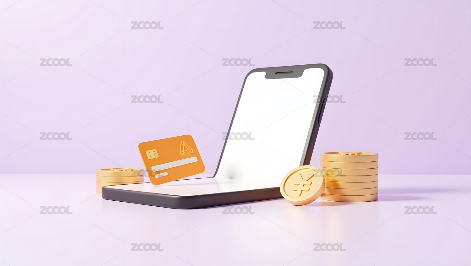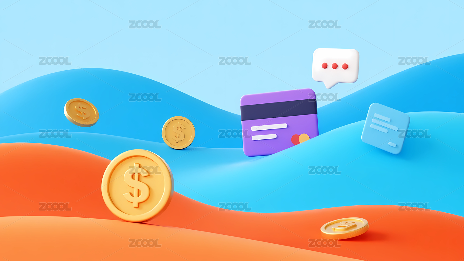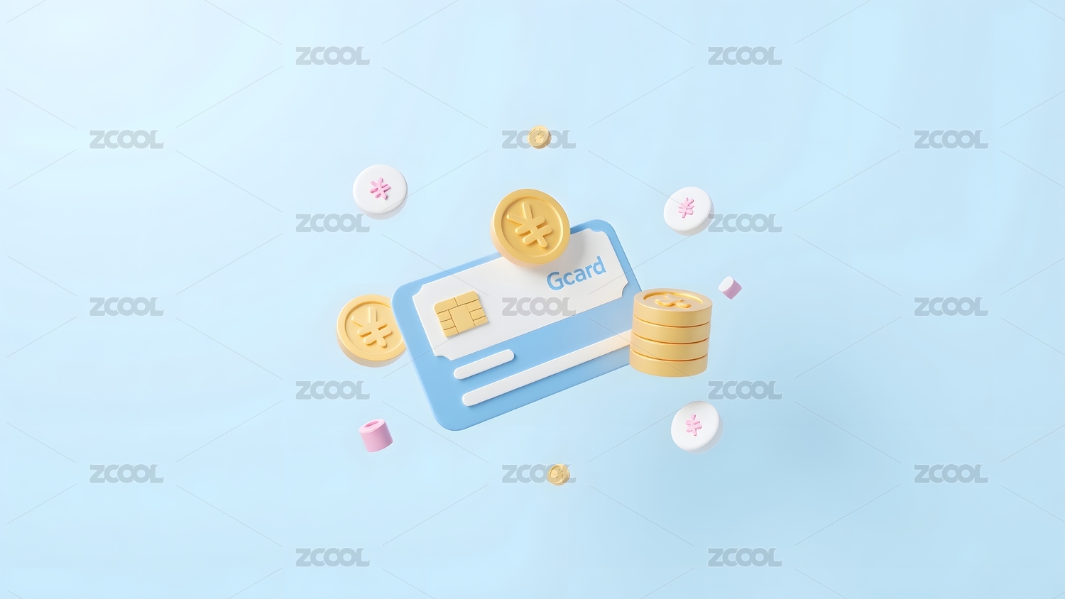 卡通银行卡和现金钞票模型3D渲染