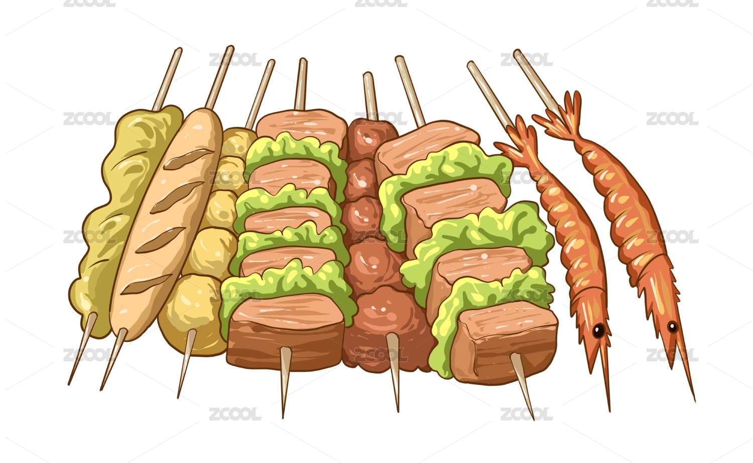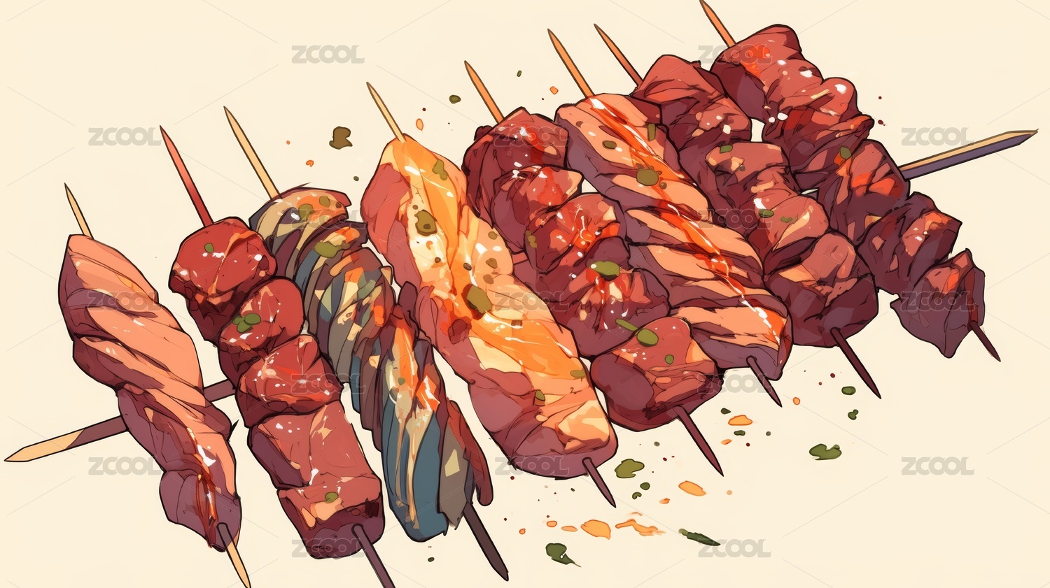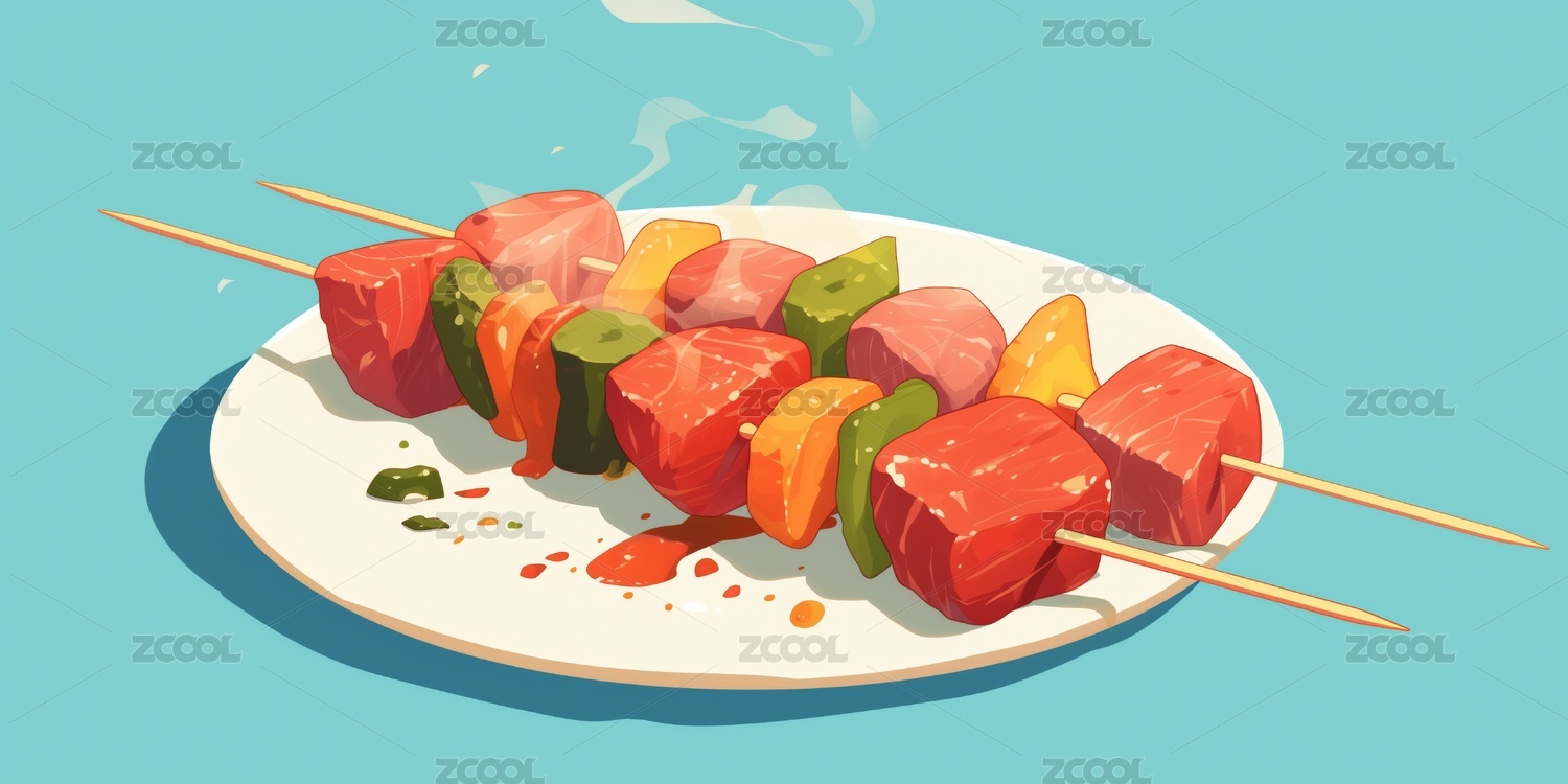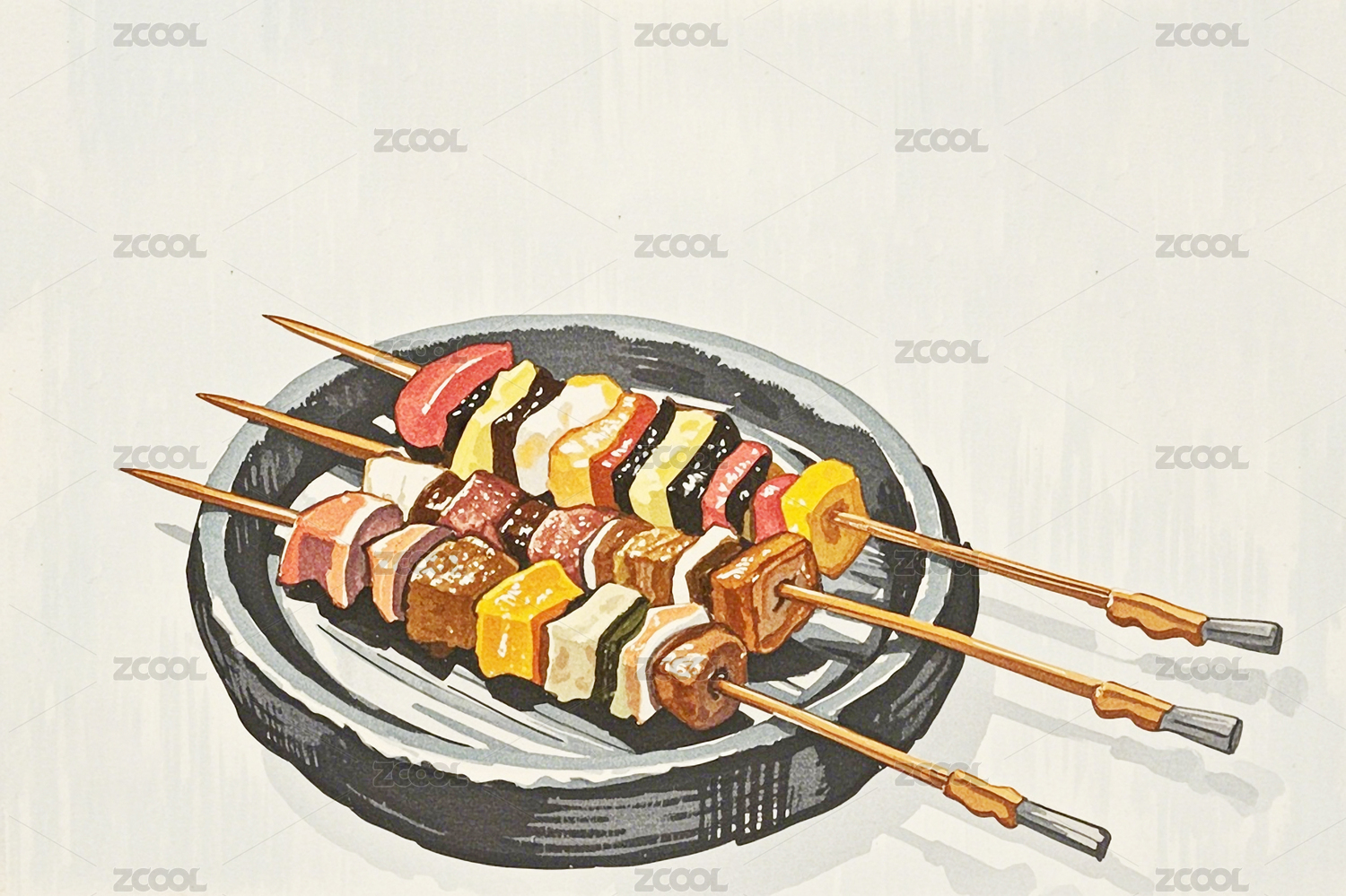 桌面盘中的烤串炸串肉串涮串插画绘画手绘