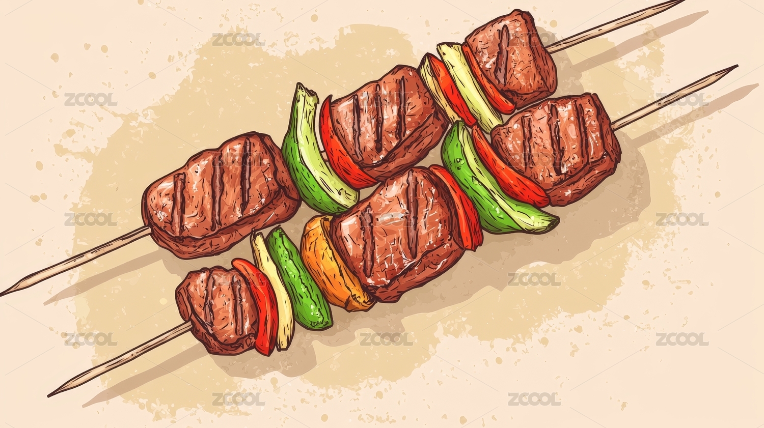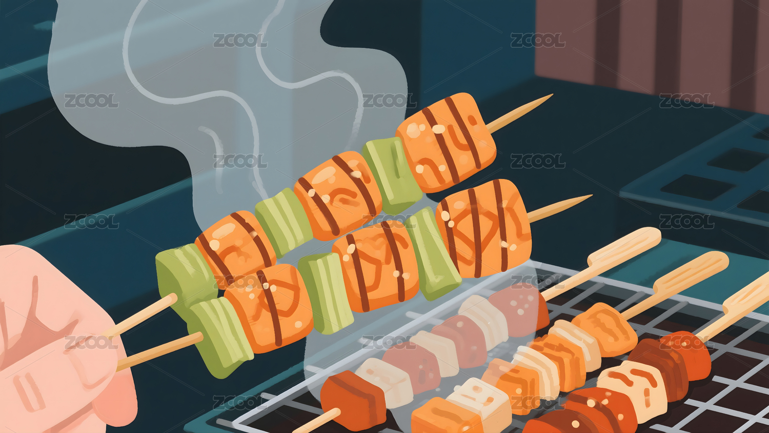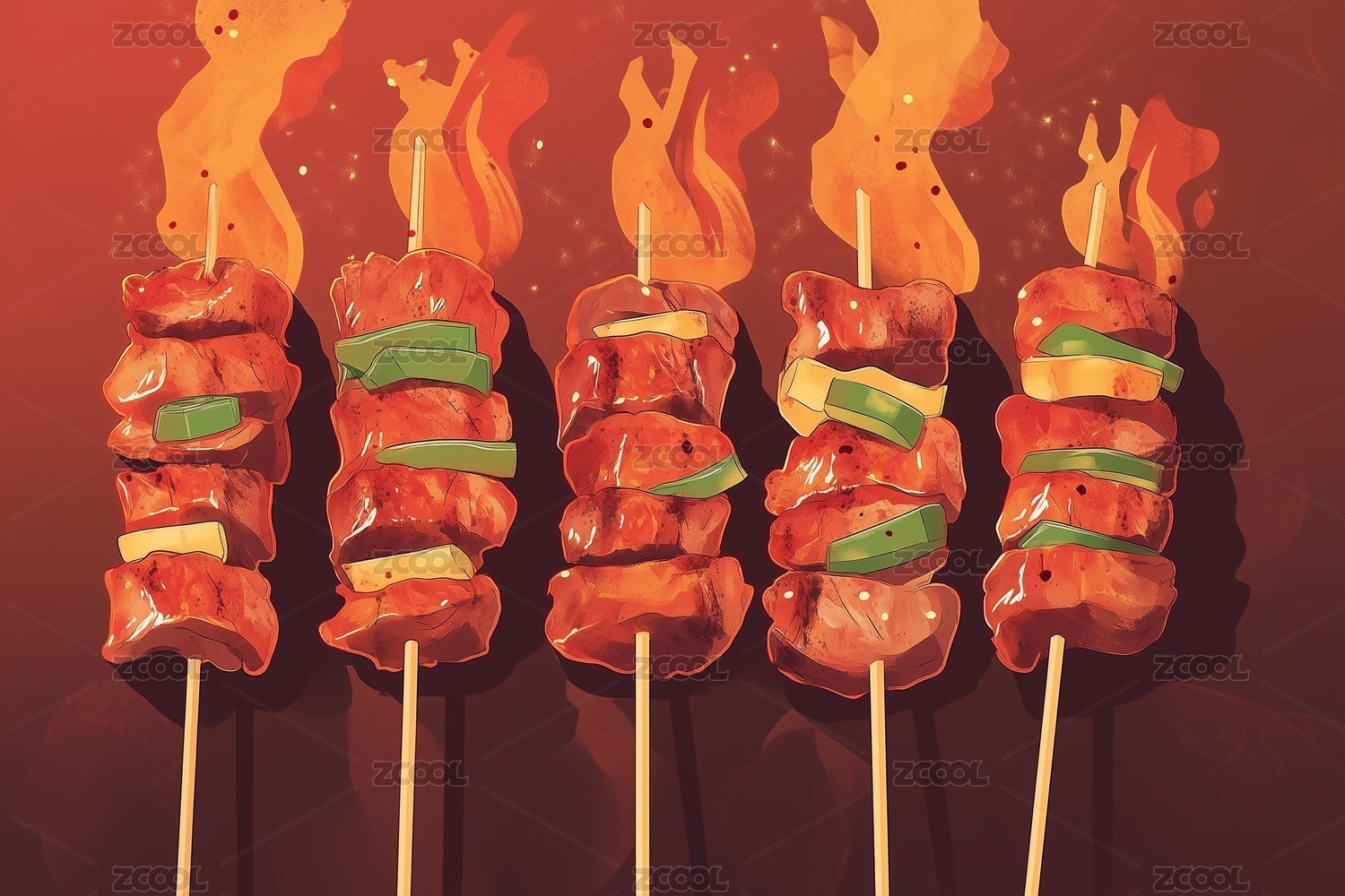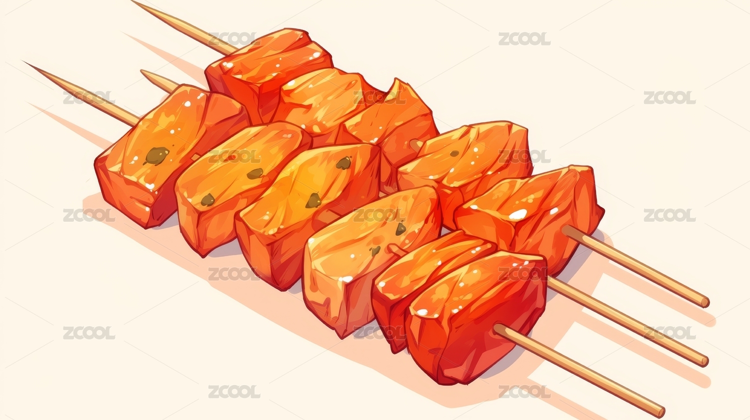 桌面盘中的烤串炸串肉串涮串插画绘画手绘
