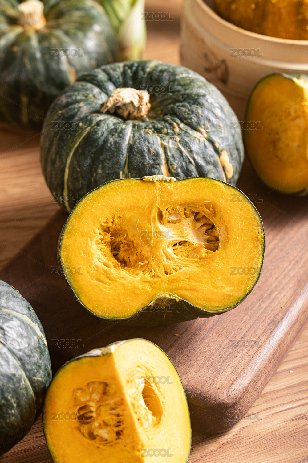 中式复古场景中切开放在桌子上的贝贝小南瓜