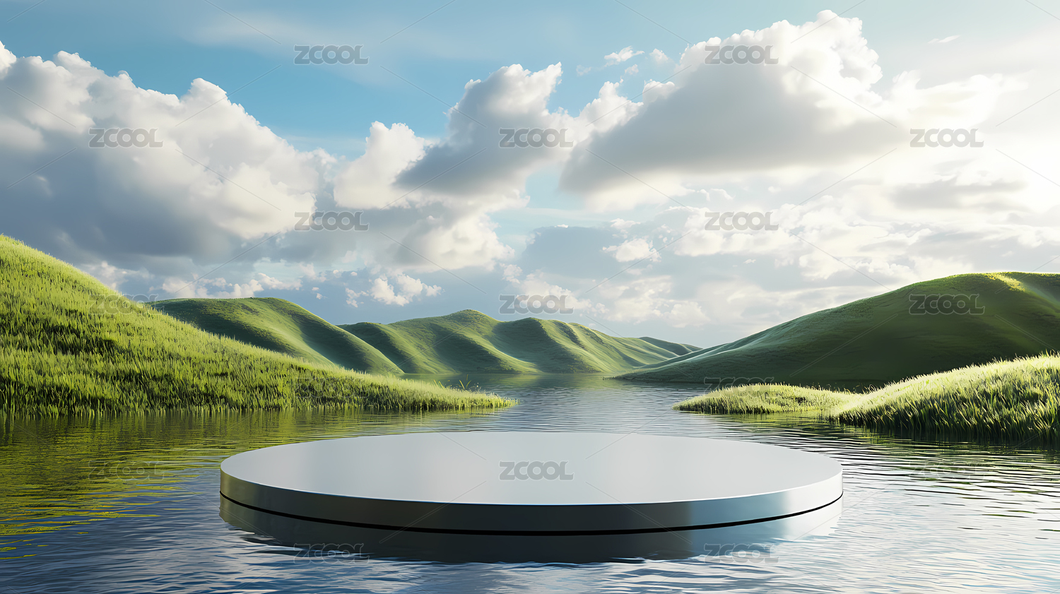 草地,水,水面,金属,圆形,镜面,自然,云,3D,展台