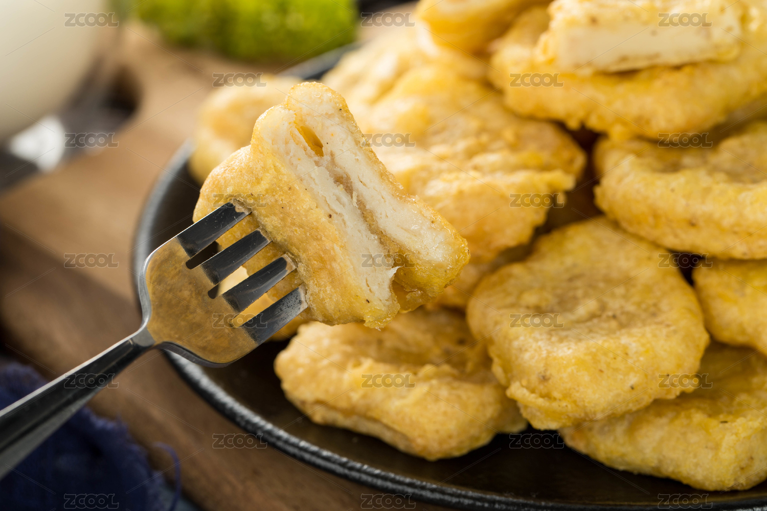 叉子插着切开的油炸鸡块放在盘装的鸡块背景上
