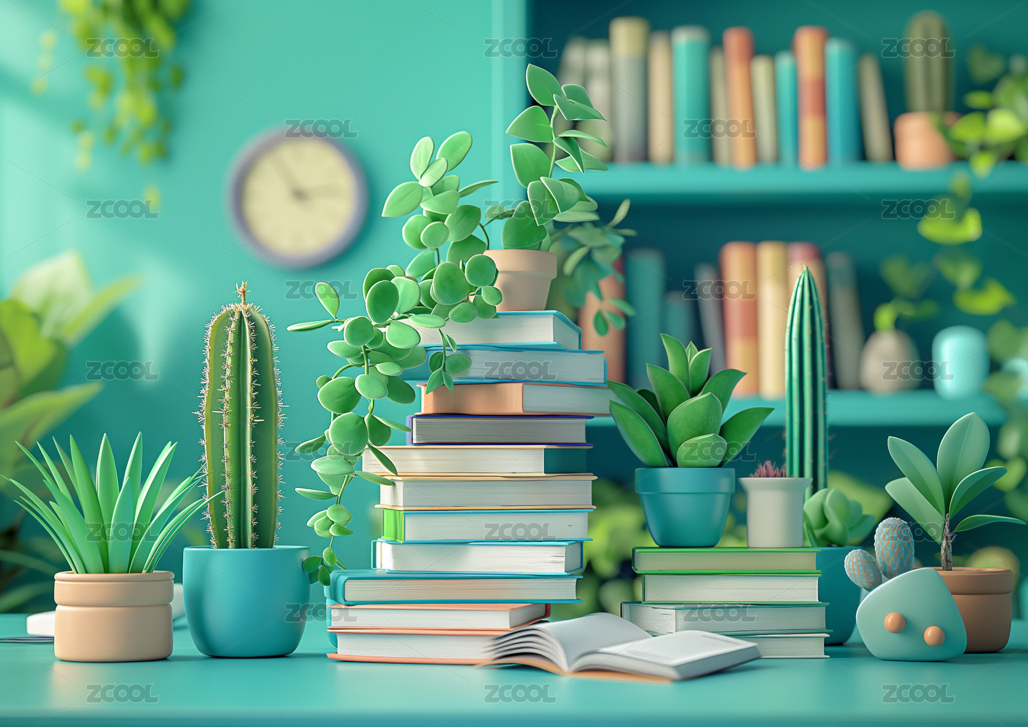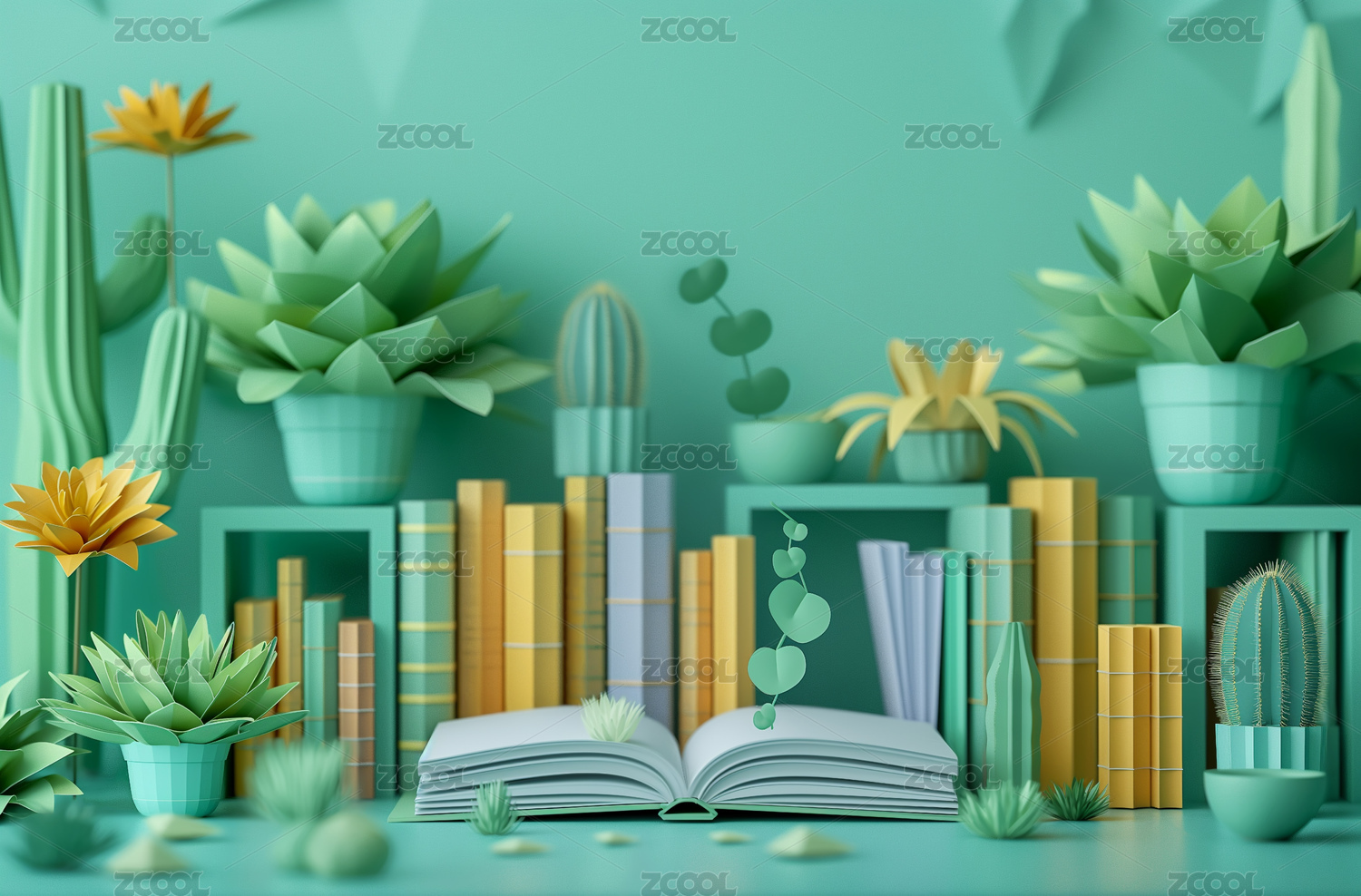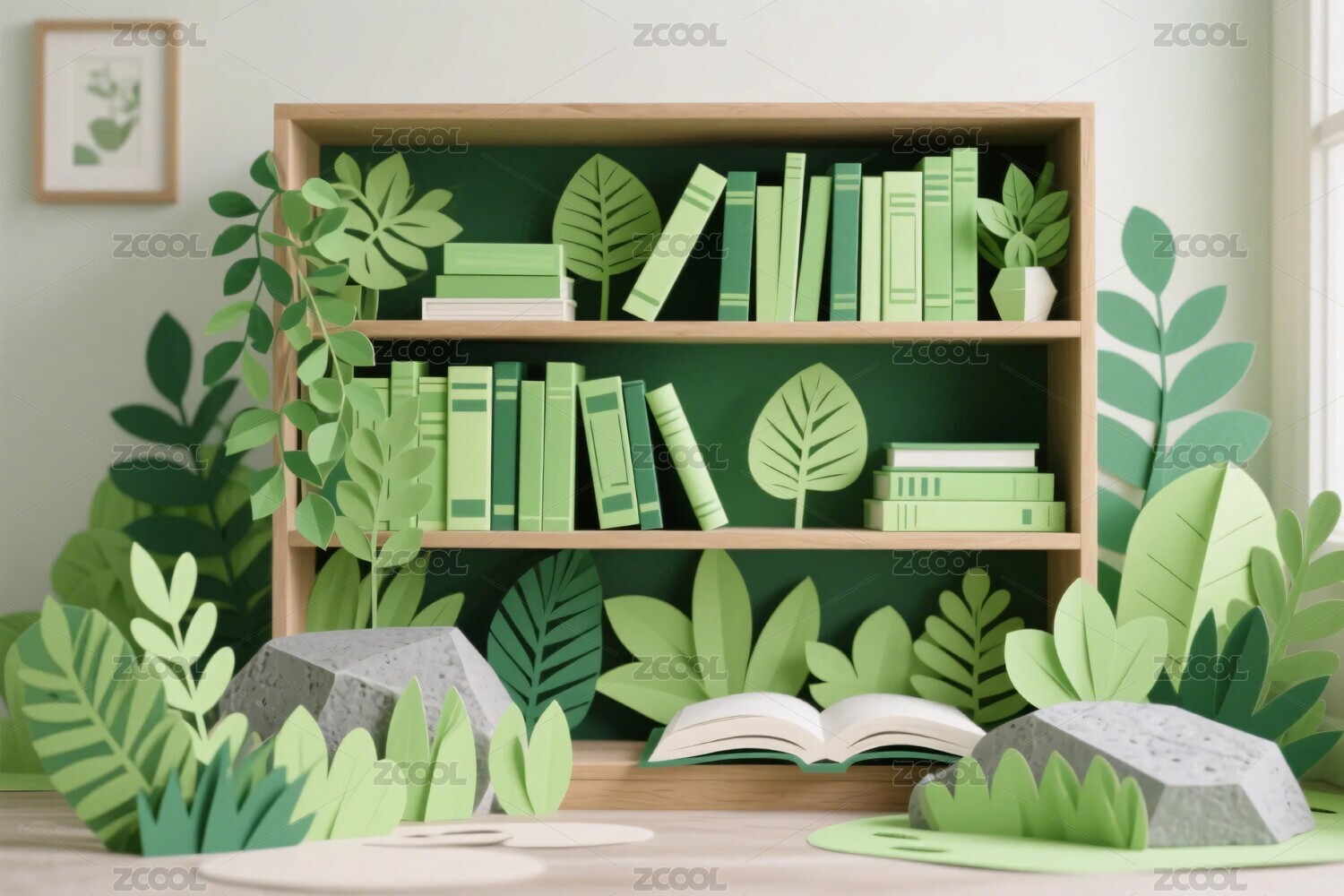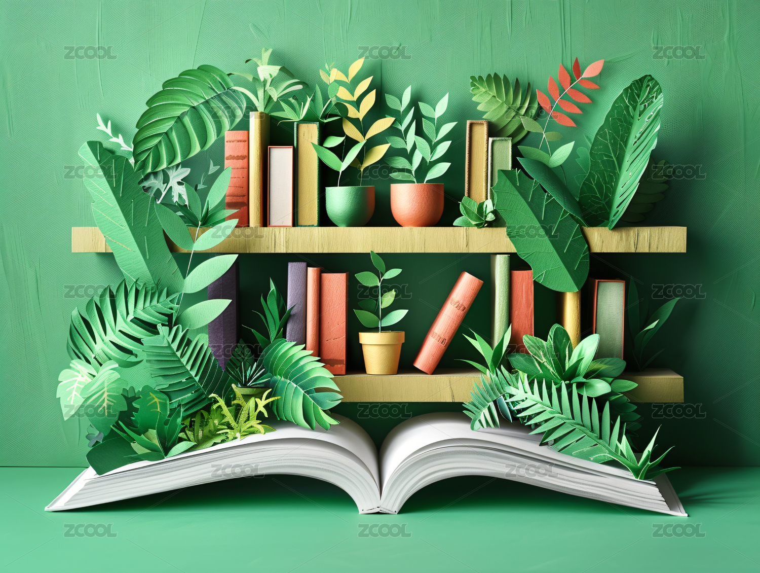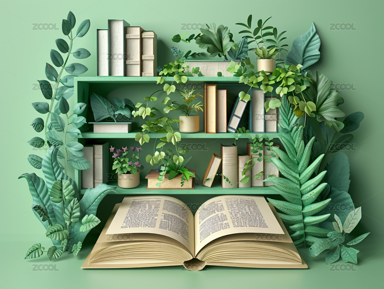 书,教育,知识,三维图形,插画,图像,书架,石,世界读书日,绿色