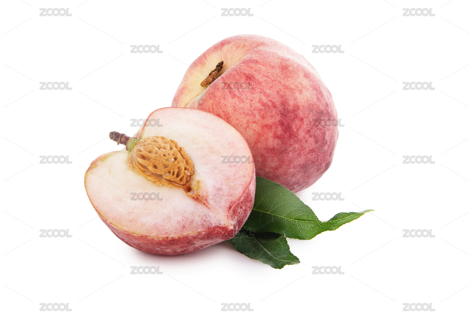 河北春蜜桃和切开半个果肉带绿叶子白底