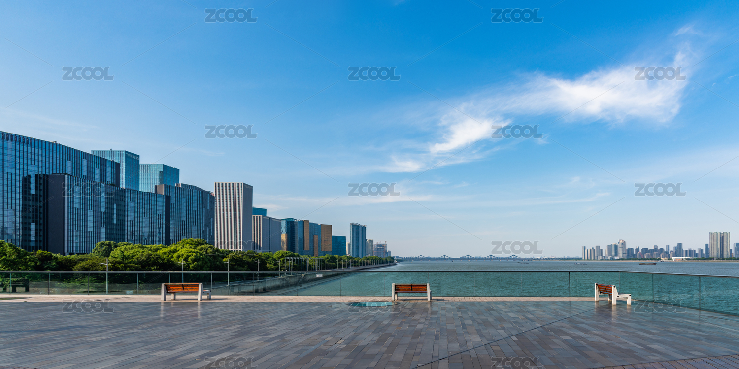 浙江杭州城市阳台风光与钱塘江畔现代建筑