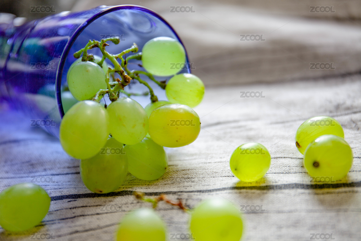 一串绿色青提放在蓝色杯子里以及散落的几个提子