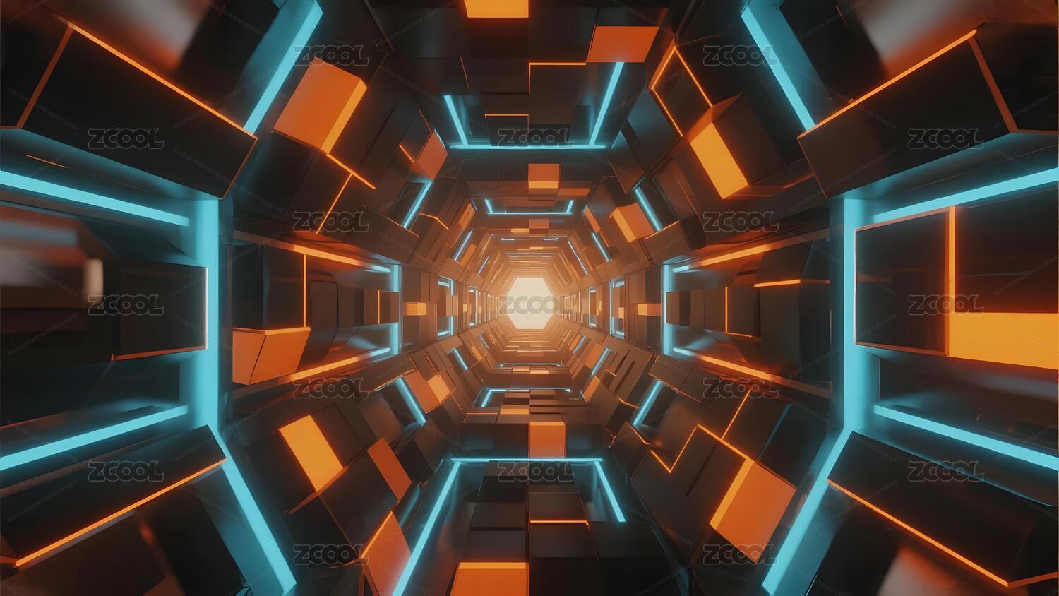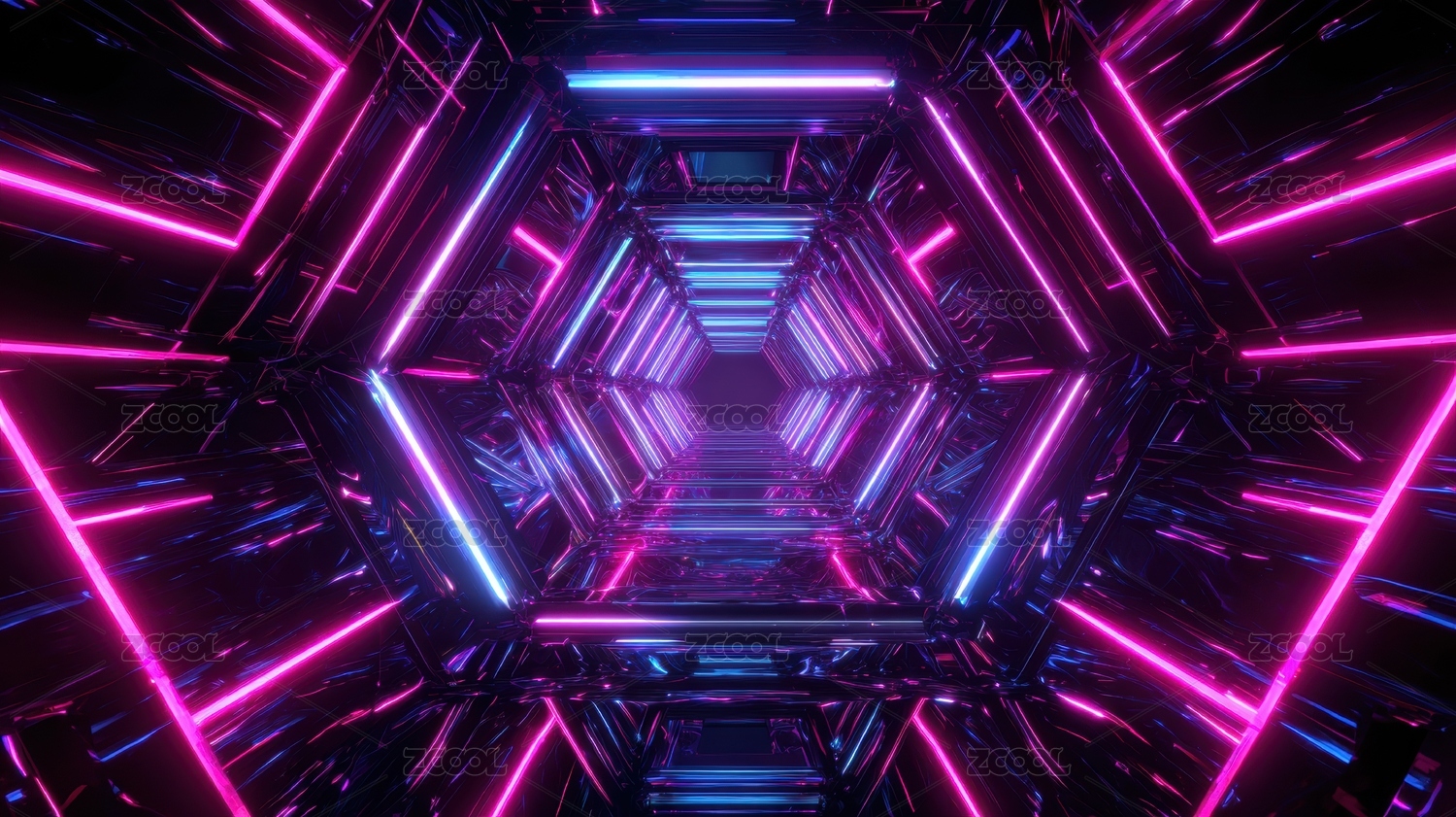 带有科技感的由红蓝色霓虹灯照明的五边形通道隧道