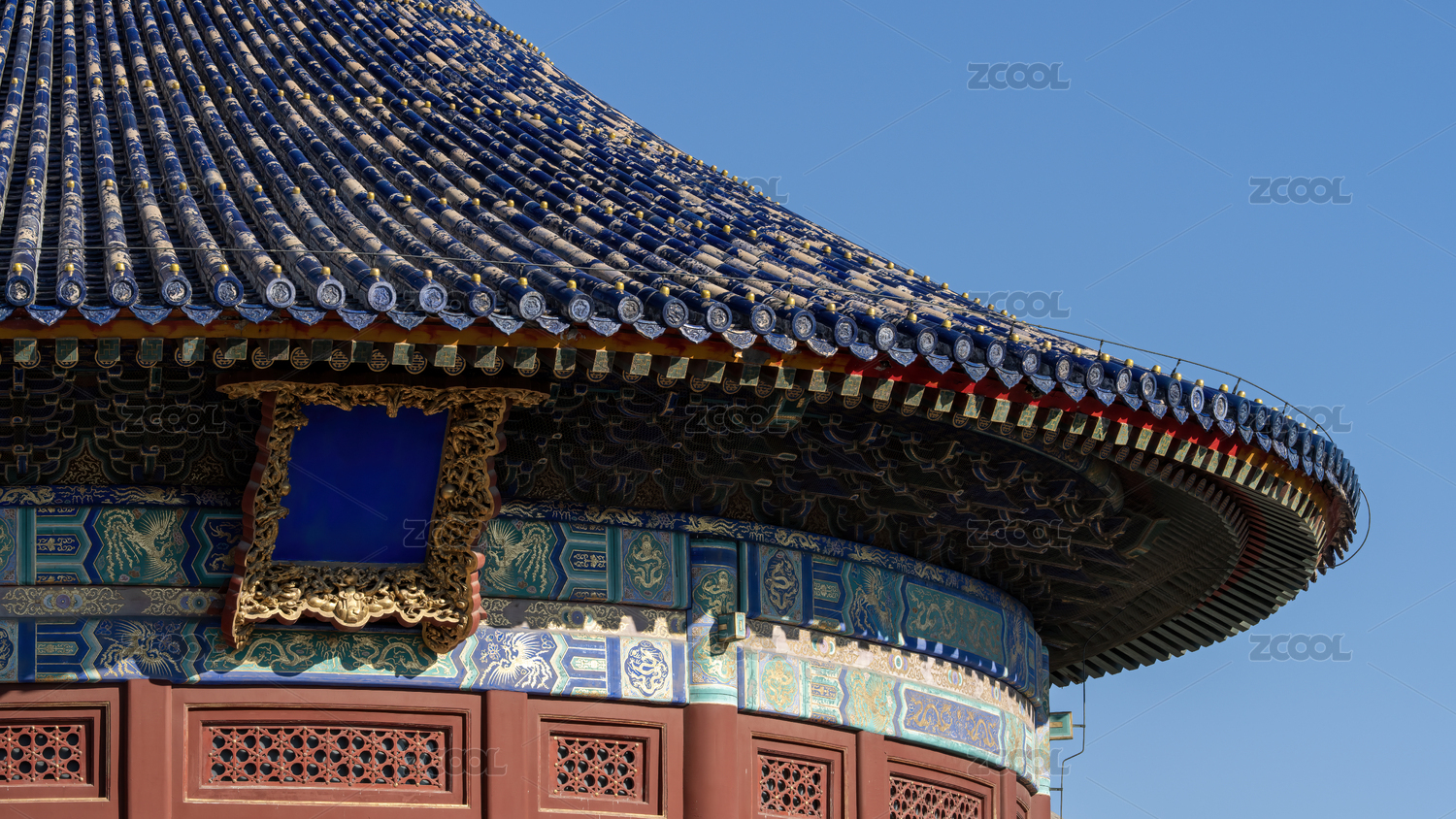 清晨阳光下的天坛皇穹宇蓝色屋顶特写