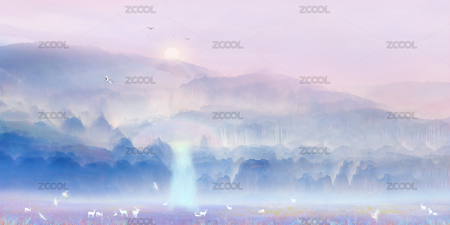 早晨太阳从山的天边升起,云雾弥漫着森林小鹿在瀑布旁的草地上喝水中国风山水插画背景海报